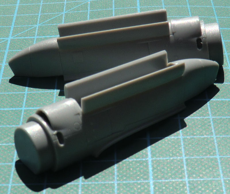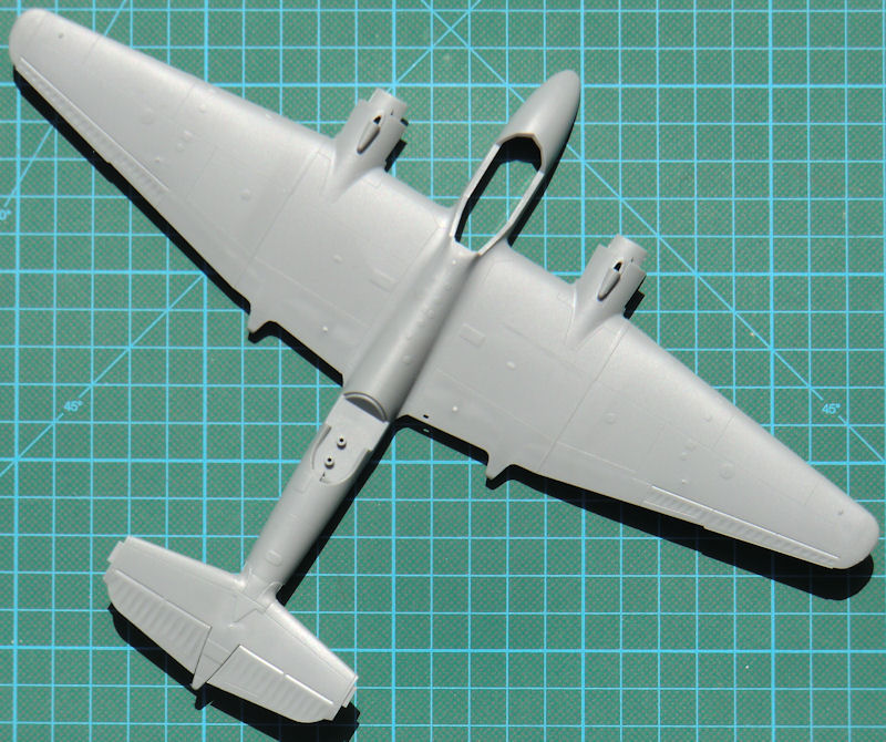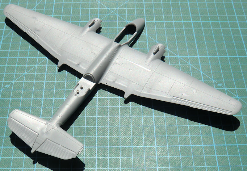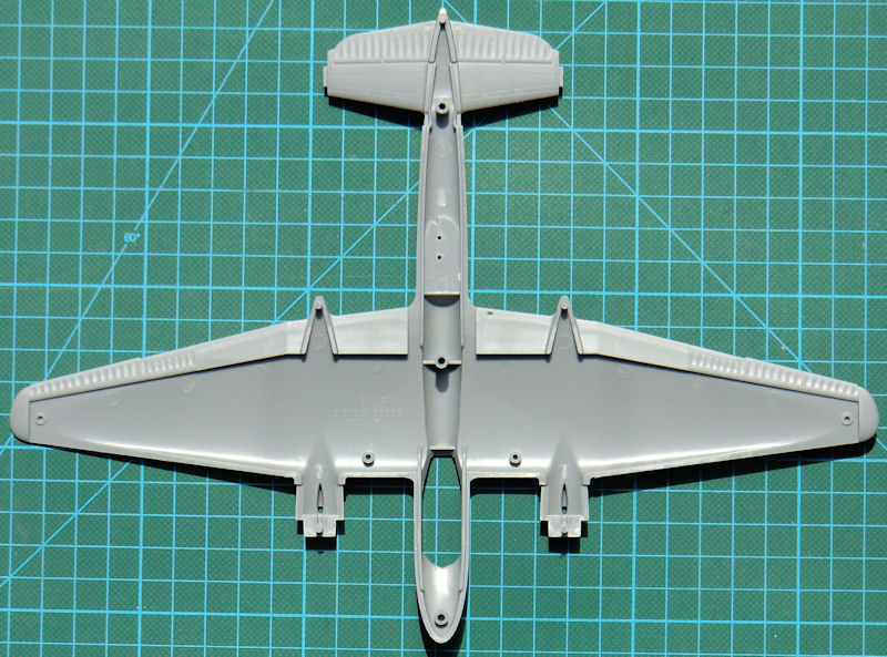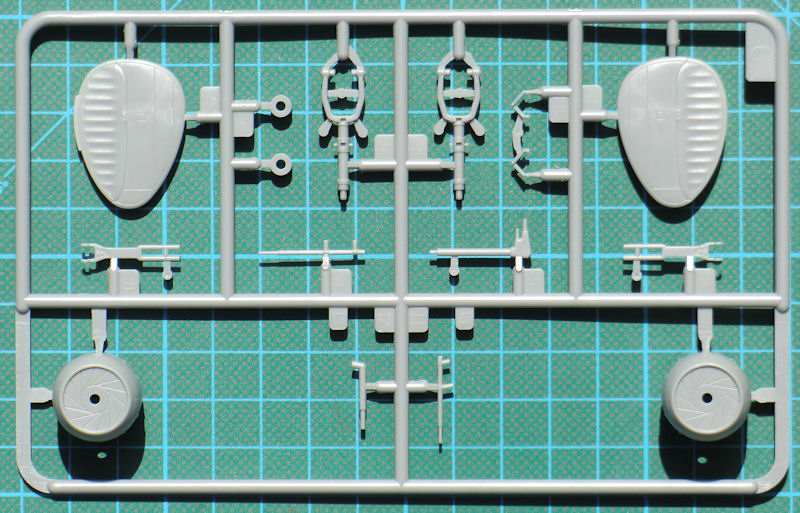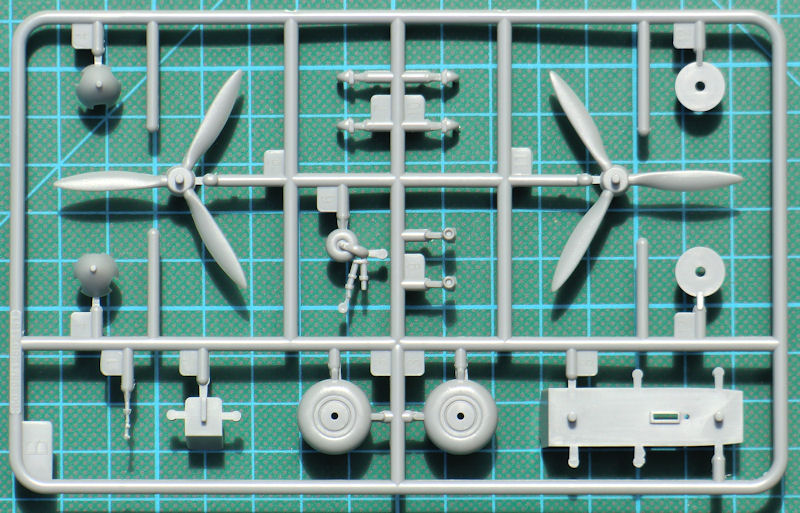 Während man bei der Macchi C.200 oder der Gladiator noch schöne zusammengefasste Details bekommt, liefert HobbyBoss für den Piloten nur eine Bodenplatte nebst Sitz und Steuerknüppel. Unten im Bug gibt es gar nichts an Teilen und in den Heckständen dient jeweils eine Stange als Abwehr-MG. Die Fahrwerkschächte sind frei von Details und die Klappen sind gleich an den Gondeln anmodelliert. Das Fahrwerk selbst sieht recht ordentlich aus. HobbyBoss liefert die Tu-2 mit Drei-Blatt-Luftschrauben aus. Positiv sind die scharfen Hinterkanten an allen Rudern und der Tragfläche.