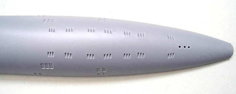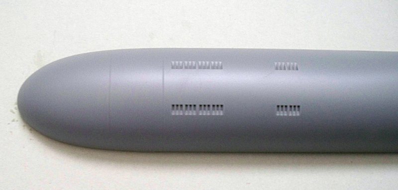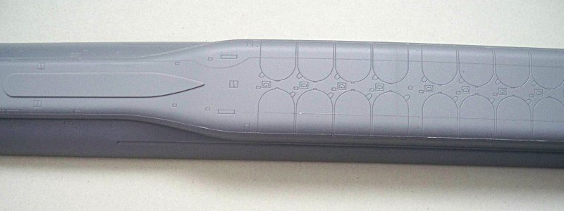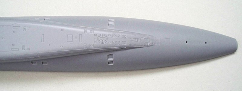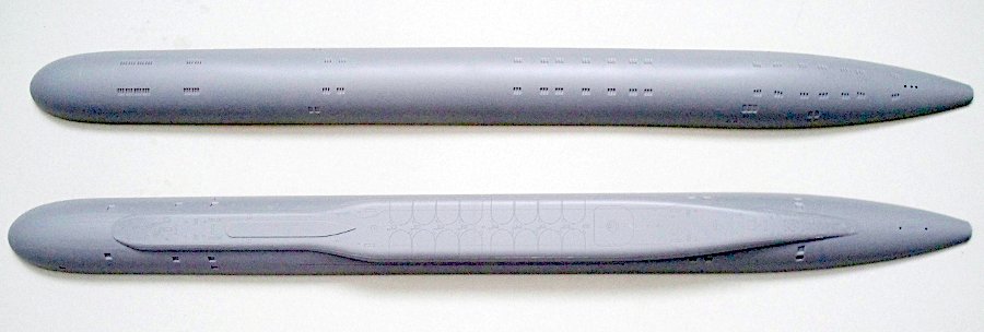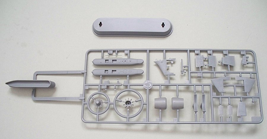 Bausatz: U-Boot Bausätze haben ja, bedingt durch die Glatte äußere Silhouette, zwangsläufig nicht all zu viele Einzelteile. Deshalb ist gerade die Umsetzung von den Gravuren auf den Rumpf des Bootes ein wichtiger Aspekt, damit das fertige Modell später nicht langweilig wirkt. Hobbyboss hat in diesem Bereich ganze Arbeit geleistet. Die negativen Gravuren über den gesamten Rumpf, sind perfekt auf dem Maßstab abgestimmt.