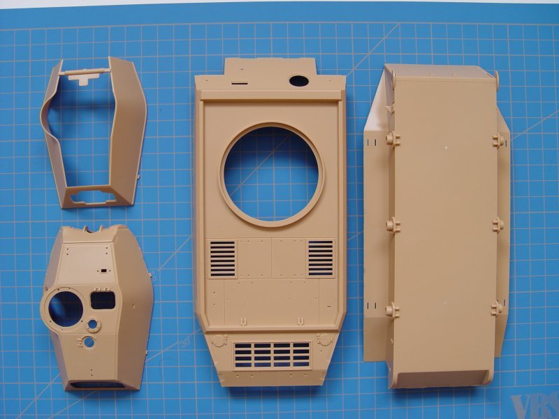 Das Oberteil und die Fahrzeugwanne sind ohne Fehler wiedergegeben. Die Passgenauigkeit ist einfach super. Alle Nieten sind sauber dargestellt. Nur die Schweißnähte hätten noch besser ausfallen können. Sie sind ein wenig zu fein, meiner Meinung nach. Dem Bausatz liegt ein kurzes Stück Kupferseil bei - fertig gezwirbelt. Sieht prima aus als Abschleppseil. Selbst die Kauschen sind schon aufgebohrt, was will man mehr. Die Kettenglieder sind gut wiedergegeben. Einfach prima. So macht Modellbau Spaß.
