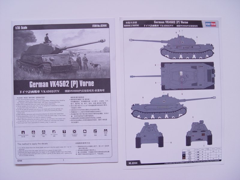 Zum Bausatz: Nach öffnen der Verpackung ist der erste Eindruck wie immer super. Das Modell präsentiert sich in einen Hobby Boss- typischen Karton. Das Deckbild wurde wieder klasse dargestellt. Die Bauanleitung ist gut und sehr übersichtlich gestaltet. Sie ist ein schwarz/weiss Druck aus 12 Seiten und in 14 Abschnitten untergliedert. Der Farbgebungsvorschlag (1 Variante- nur Panzergrau) ist separat auf einen Blatt in Hochglanz-Farbe gedruckt.