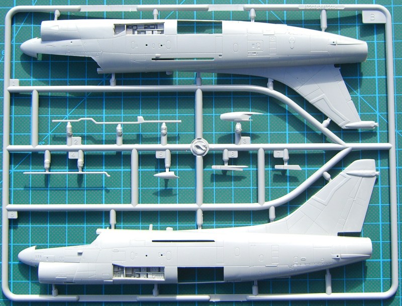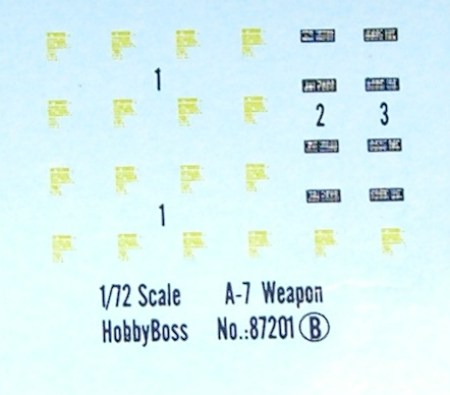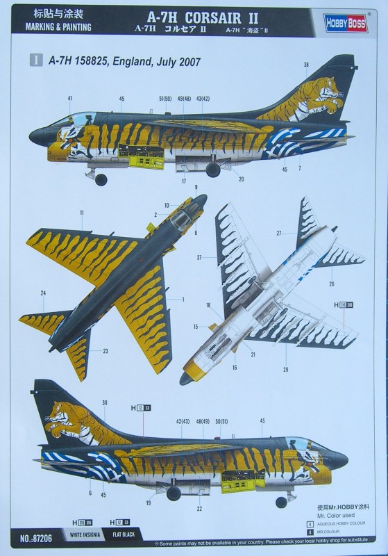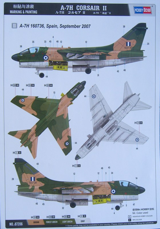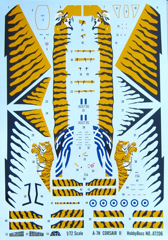 Bausatz: Hier gilt natürlich alles zuvor bei der A-7E geschriebene. Im Prinzip wurden die Decals geändert. HobbyBoss hat die A-7H mit einer Nachtankeinrichtung versehen. Das ist bekanntlich falsch. Hier fehlt dann das typische Blech der A-7H. Das muss dann in eigener Regie hergestellt werden. Weitere „Macken“ sind mir nicht aufgefallen. Toll ist der große Decalbogen für die Sonderbemalung. Ob man diese jedoch alle passend auf die Maschine bekommt…