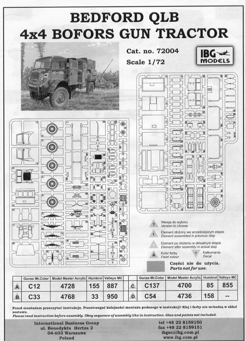 Das Modell Das Modell des Bedford QLB lässt sich unter Berücksichtigung der in der Beschreibung vom QLR genannten Verfeinerungen, kleineren Schwierigkeiten bzw. Fehlern sehr leicht bauen. Das an der Rückwand der Mannschaftskabine anzubringende Rad der Bofors-Lafette und die auf dem Deckelbild zu sehende Bofors-AA-Gun, lässt die Vermutung aufkommen, dass IBG Models später diese 40mm-Flak als Spritzguss-Bausatz herausbringt. Bisher gibt es nur das recht grobe 1:76er AIRFIX-Modell und den sehr teuren Planet-Models/CMK Resin/Ätzteil-Bausatz, der auch leider kein gedrehtes Rohr beinhaltet.