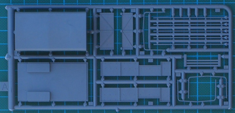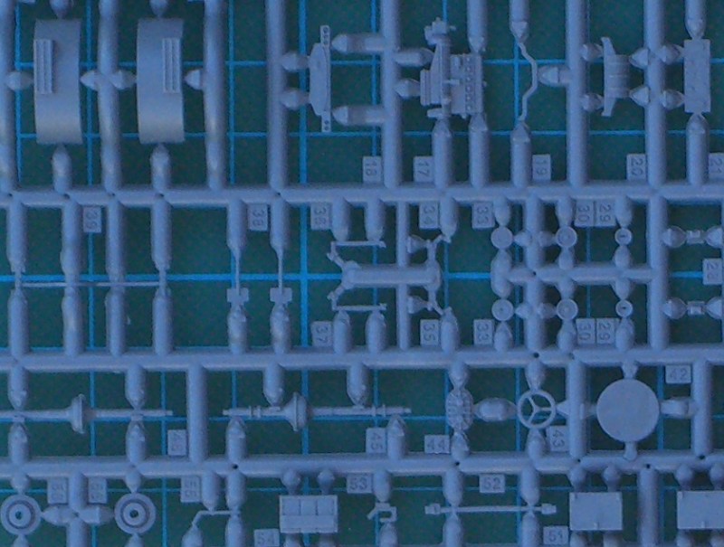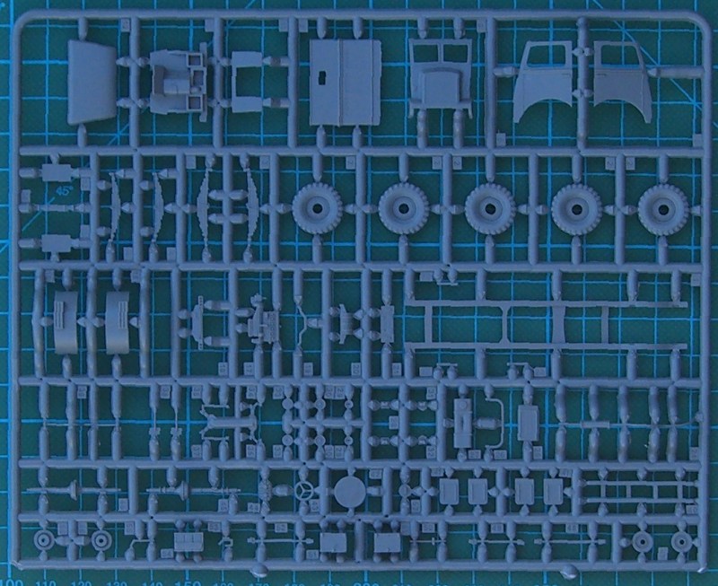Die Bauteile verteilen sich auf zwei graue Spritzgussrahmen (der Kofferaufbau gehört zu einer anderen Version). Dazu gibt es noch einen Decalbogen. Klarsichtteile konnte ich nicht entdecken (Da ich einen Vorabmuster hatte, denke ich, dass in der Serie der in der Bauanleitung gezeigt Fotofilm beiliegt.). Hier hilft dann Cristal Klear oder eine durchsichtige Folie weiter. Beim Betrachten der Bauteile kommt richtige Freude auf. Man hat bei IBG sogar die Motornachbildung nicht vergessen. Es gibt ein recht gut ausgestattetes Rechtslenkerfahrerhaus. Dessen Karosserie besteht aus sieben Bauteilen. Dafür gibt es auch einen sehr gut strukturierten Kühlergrill. Auch die Achsen, Gelenkwellen sowie das Verteilergetriebe hat man sehr fein nachgebildet. Die Auspuffanlage ist schlichtweg eine Wucht. Beim Tank gab es bei mir eine Sinkstelle, die wohl einfach zugespachtelt werden kann.