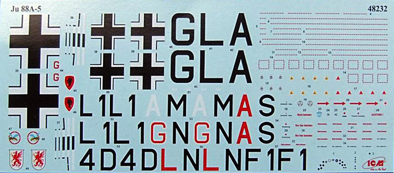 Bemalung: Die Decals machen einen guten Eindruck und fast alle Stencils sind vorhanden. Neben der späten A-5 Ausführung, welche im Herbst 1941 in Finnland stationiert war und dem KG/30 angehörte, gibt es drei frühe Ausführungen zu bauen.