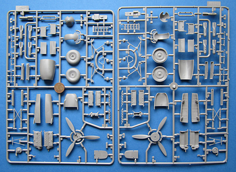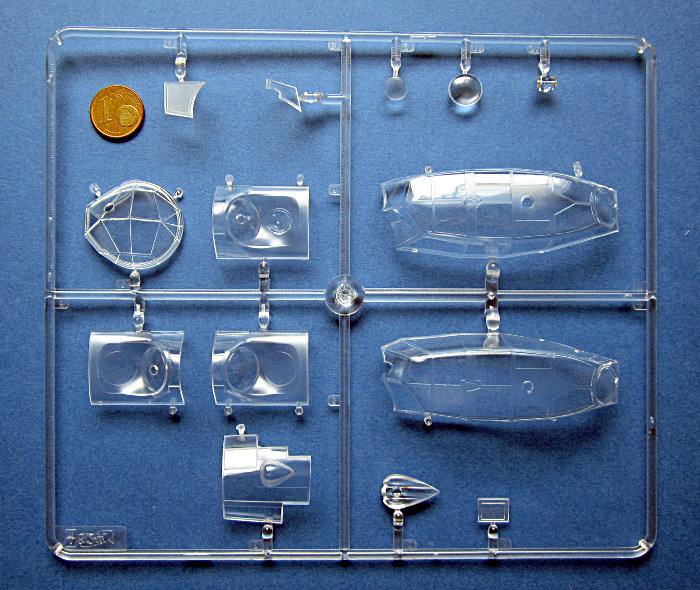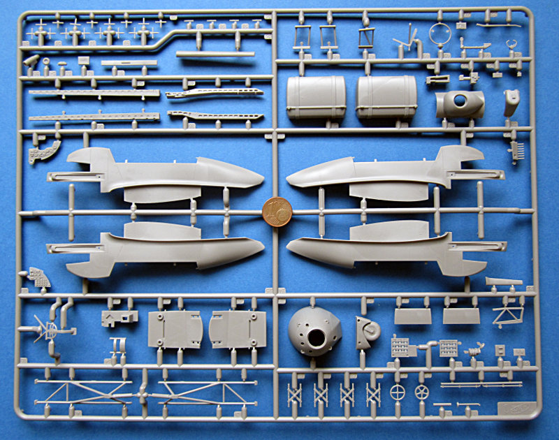 Die Hauptfahrwerkschächte sind etwas vereinfacht und haben ein paar Auswerfermarken. Nach vorne schließt ein Brandschott mit Motoraufhängung und DB 601 an. Die Motorgondel ist mehrteilig und könnte somit auch offen dargestellt werden. Eine weitere Detaillierung des Motors, Kühlers und das Motorraumes sind in diesem Falle aber zu empfehlen. Die Verstrebungen der Fahrwerksbeine und insbesondere die Schutzbleche machen einen sehr guten Eindruck, während die Räder durchaus etwas überarbeitet werden können (auf jeden Fall etwas abflachen). Propeller und Spinner wirken am Spritzling etwas einfach (nur zwei Teile). Die Klarteile sind dünn und schlierenfrei und haben augenscheinlich die richtige assymmetrische Form.