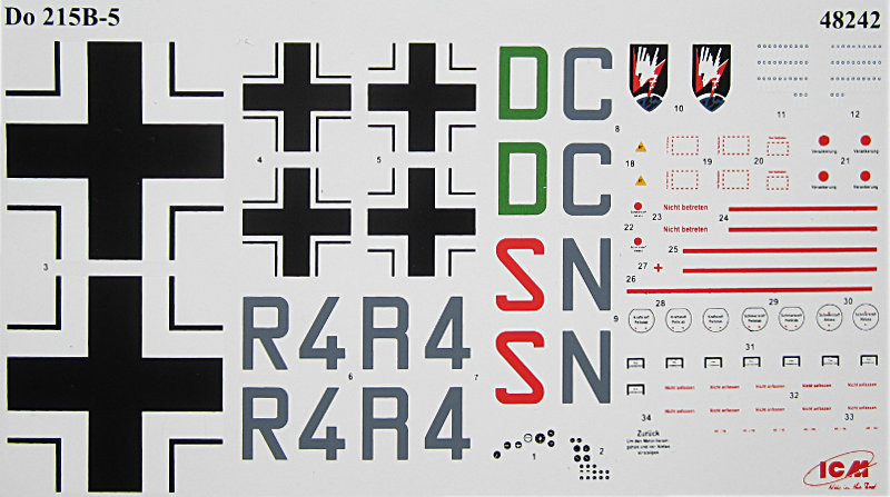Die Bauanleitung ist eigentlich ganz gut. Die Schritte sind übersichtlich und haben sogar Farbangaben. Im Cockpit wird das aber noch nicht vollständig ausreichen, so dass man etwas recherchieren muss (z.B. Funkgeräte). Auch für die jeweilige Version muss man etwas recherchieren, z.B. für das eingebaute Spannergerät oder die Waffen, die Nase ist nämlich leer. Die Bemalungsanleitung für die 2 enthaltenen Markierungen zeigt eine Draufsicht und eine Unterseite der getarnten Maschine sowie für die einzelnen Varianten je eine rechte und linke Ansicht. Allerdings ist der Kontrast wie insgesamt die Ausführung des Drucks eher schwach.