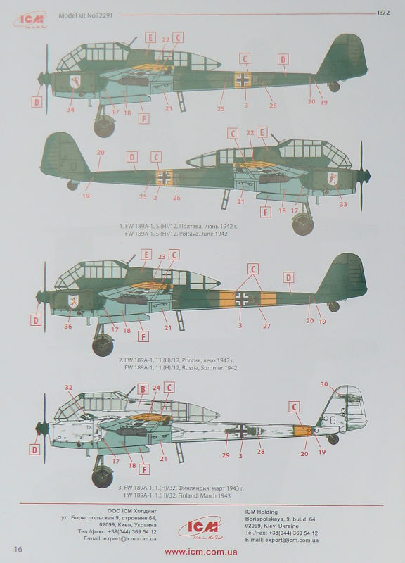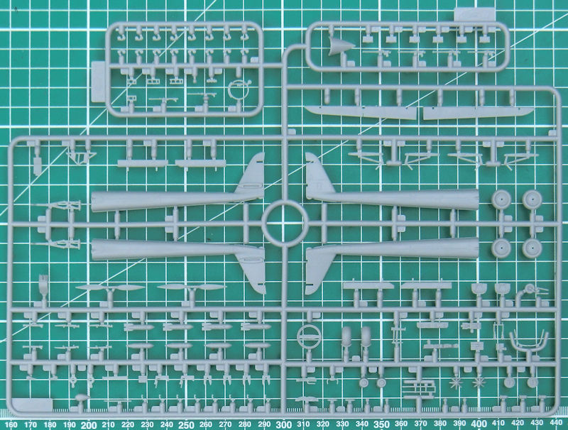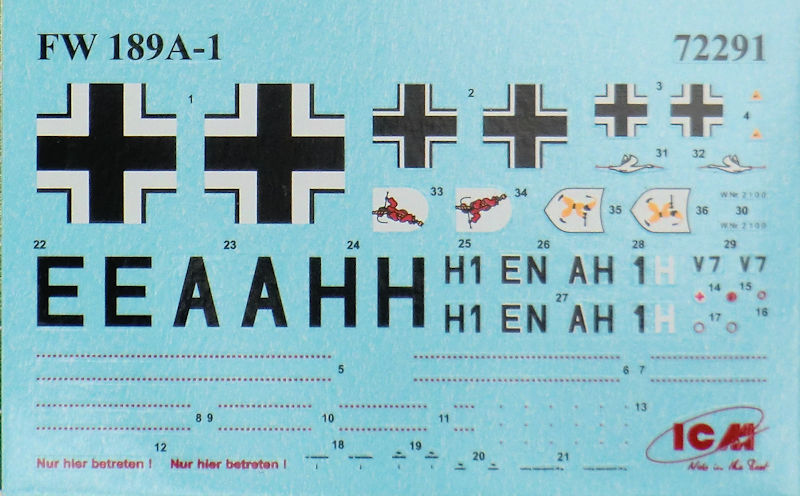 Bausatz: ICM hatte vor einiger Zeit mal einen Bausatz der Focke Wulf Fw 189A in 1/48 angekündigt. Nun gibt es dieses auffällige Flugzeug im Sammelmaßstab 1/72. In der typischen stabilen sehr praktischen Verpackung mit Klappdeck befinden sich gut verpackt zwei hellgraue Spritzlinge mit 128 Einzelteilen, ein klarer Spritzling mit 19 Teilen, eine mehrfarbige Bau- und Bemalungsanleitung und einen Decalbogen. Ein paar Teile sind für eine andere Version und diese wandern in die Restekiste. Die Abspritzung ist voll auf der Höhe der Zeit. Bei ICM gab es in den letzten zehn Jahren einen riesigen Entwicklungsschub. Insbesondere bemühte man sich in der Ukraine um eine deutlich verbesserte Passung.