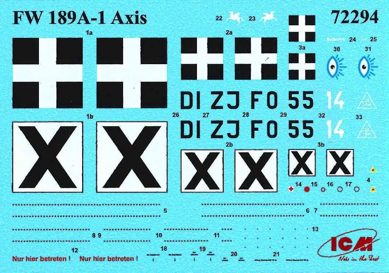 Bausatzgeschichte: Vor über 60 Jahren brachte AIRFIX die erste Focke Wulf 189 heraus. Anfang der 1970er folgte dann eine von AOSHIMA, die etwas bessere Klarsichtteile hatte. Sowohl AIRFIX, als auch AOSHIMA enthielten lediglich Abziehbilder für die deutsche Luftwaffe. Mitte der 1990er Jahre folgte dann die negativ gravierte FW 189 von CONDOR. Der von MPM / ITALERI übernommene Bausatz enthielt Abziehbilder für Ungarn, die Slowakei und auch die Luftwaffe. Von MPM/Special Hobby gibt es die einzige Focke Wulf Fw-189 B (Trainer Variante) [eingesetzt in Ungarn und Deutschland).