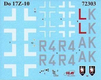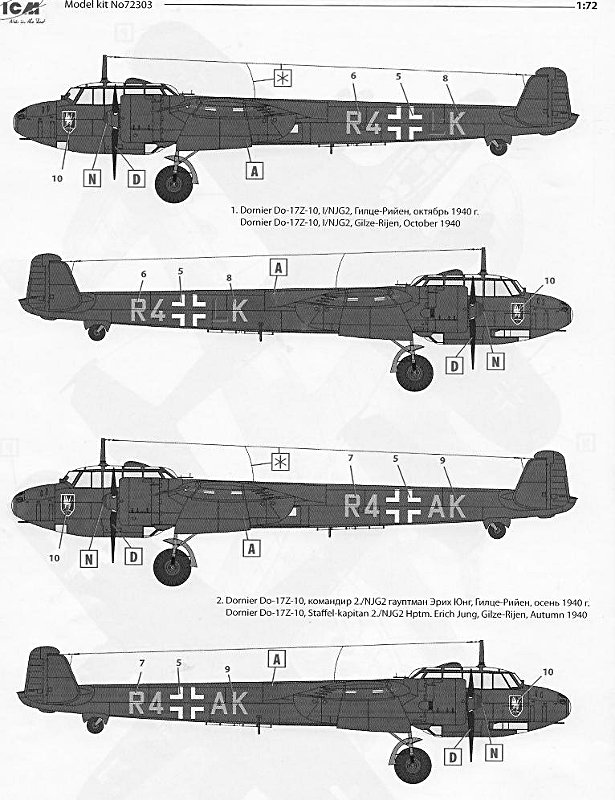 Bausatz: Nach dem Do 215 Nachtjäger lasst ICM jetzt die Do 17 Z-10 folgen. Diese basiert auf den Formen ihres großen Bruders in 1/48. An vier Spritzlingen befinden sich 194 graue plus 12 Klarsichtteile , die in einer separaten Folie verpackt sind. Die 20 seitige Bauanleitung führt in 77 Schritten klar und übersichtlich zum Ziel.