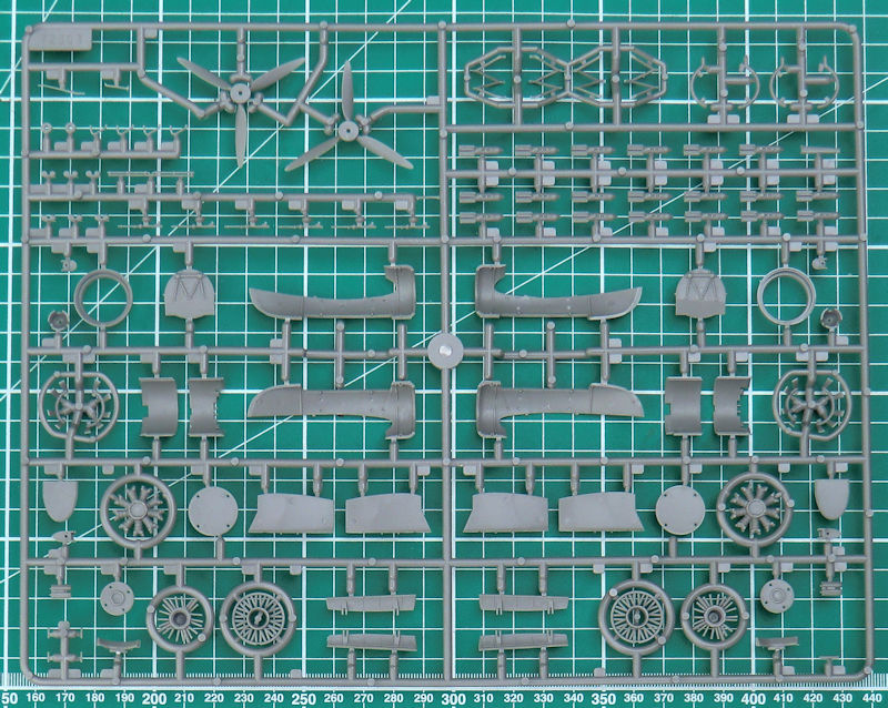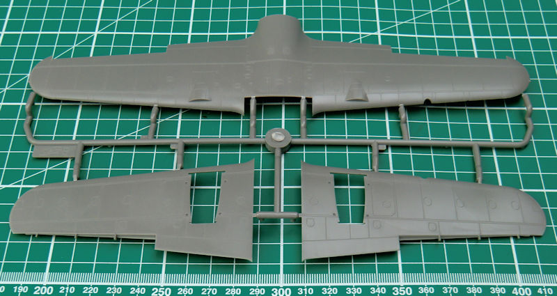 Das Heckfahrwerk bildet mit der ihm umgebenen Verkleidung eine Einheit. Der Zusammenbau wird erleichtert aber die Bemalung wird schwieriger. Da beim fertigen Modell die Bombenschächte offen bleiben können hat man bei ICM auch an eine Inneneinrichtung gedacht. So gibt es nicht nur den großen Rumpftank sondern auch die Abwurfanlage für die Bomben. Letztere sind natürlich in ausreichender Anzahl vorhanden. Beim Hauptfahrwerk hat man sich ans Original gehalten und selbst die an den Kotflügeln befindlichen Abweise nicht vergessen. Sie wirken bedingt durch die Grenzen der Spritzgusstechnik überdimensioniert.