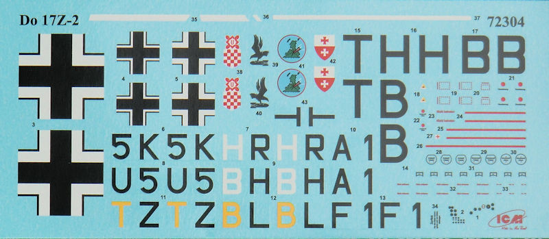 Der Decalbogen ist tadellos im Register auf hellblauem Trägerpapier gedruckt. Viele Wartungshinweise sind vorhanden. Die Farbangaben sind für die Systeme von Revell und Tamiya. Zusätzlich werden die RLM-Töne mit angegeben.