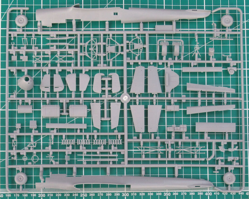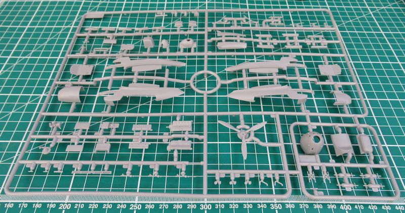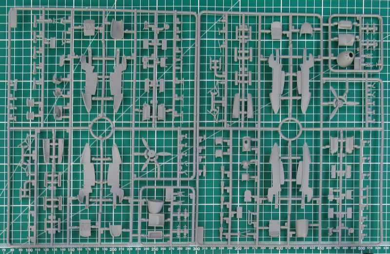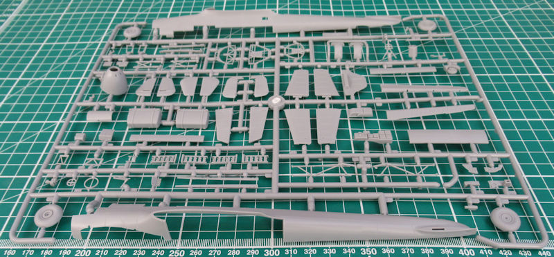In dem attraktiven stabilen firmentypischen Karton befinden sich sehr gut verpackt vier hellgraue Spritzgussrahmen mit 236 Teilen, zwei klare Spritzlinge mit 16 Teilen, ein Decalbogen und die mehrfarbige Bau- und Bemalungsanleitung. Ein paar Teile sind für andere Versionen bestimmt und wandern in die Restekiste.