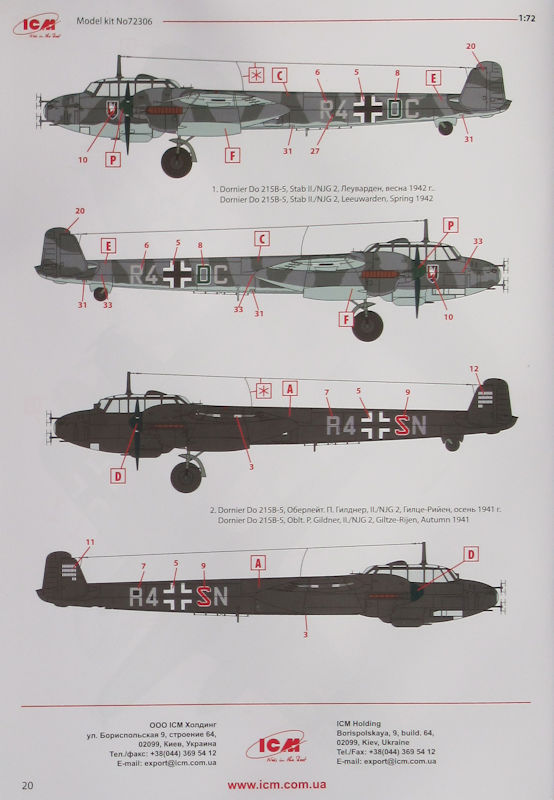 Bausatz: ICM hatte 2008 schon mal eine Dornier Do 215B-5 im Maßstab 1/72 im Angebot gehabt. Dieser Bausatz sah in der Kiste sehr gut aus. Der Teufel hatte sich in der Passung versteckt. So wurde damals meine Do 215B niemals fertig. Daher freue ich mich, dass ICM die neuere Dornier Do 17Z als Basis für eine neue Do 215-Reihe genommen hat.