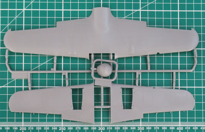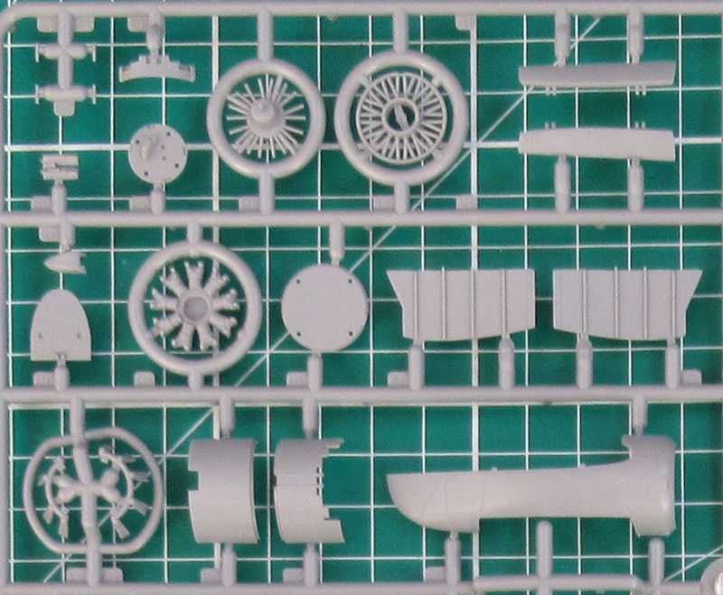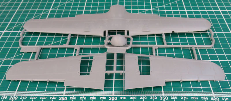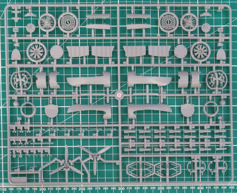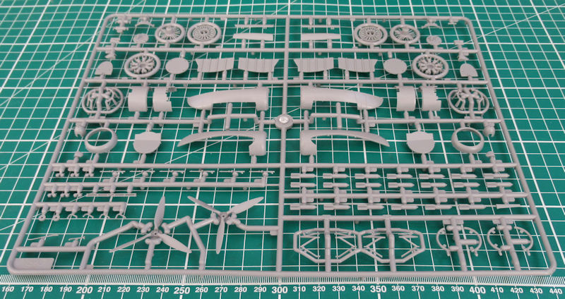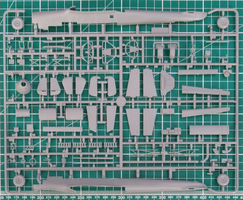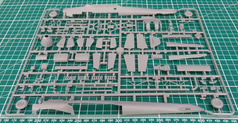 In dem stabilen praktischen Karton befinden sich gut verpackt vier graue Spritzlinge mit 179 Einzelteilen, ein Klarsichtrahmen mit zwölf Teilen, ein Decalbogen und die mehrfarbige Bau- und Bemalungsanleitung. Ein paar Teile sind für andere Versionen bestimmt und wandern in die Restkiste. Die Detaillierung ist zeitgemäß. Es gibt feine versenkt Strukturen und wunderschöne Details.