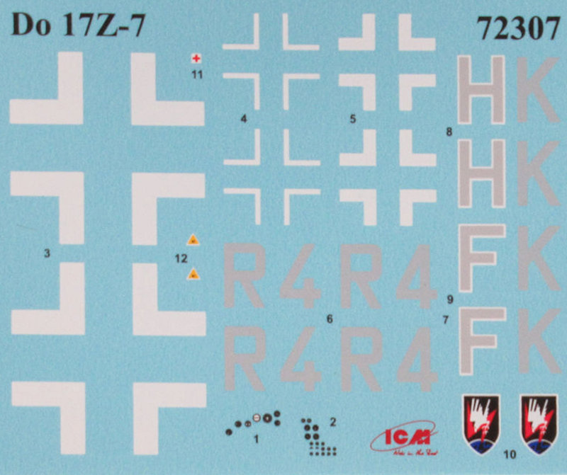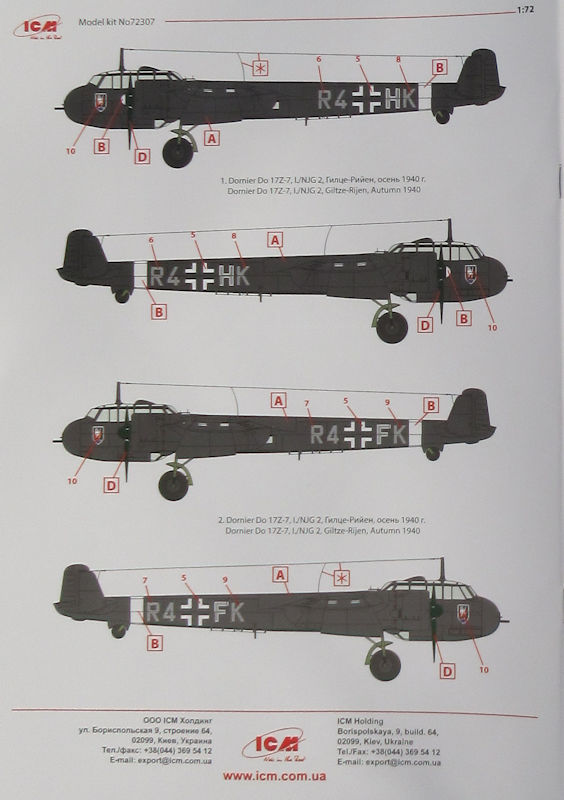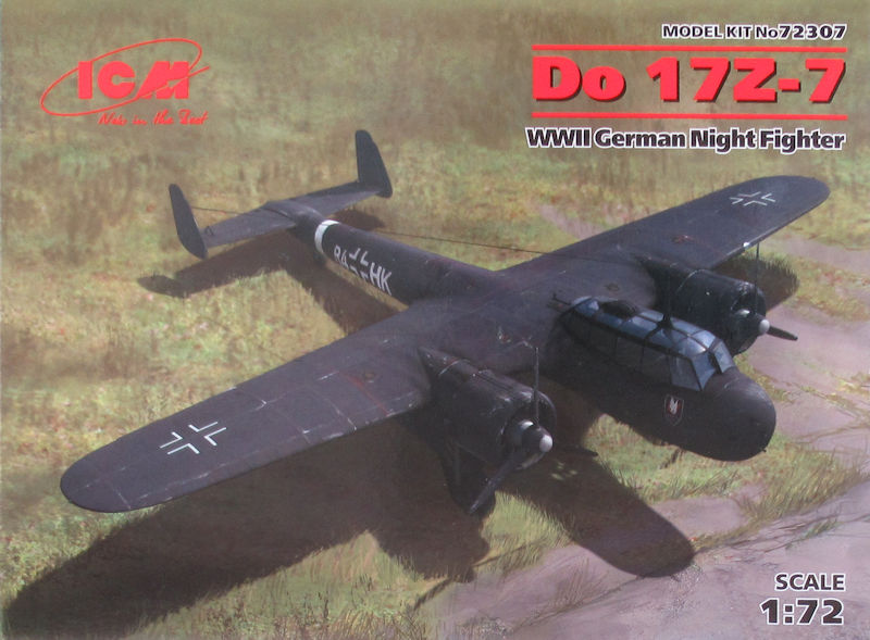 Bausatz: Schon 2007 hatte uns ICM mit dem Beginn einer Do 215/17-Reihe in 1/72 überrascht. Im Kasten sahen die Bauteile auch sehr gut aus. Leider setzte sich das nicht beim Bau fort, denn hier passten kaum größere Bauteile zueinander. Das Ganze war ziemlich frustrierend, denn zu dem Zeitpunkt gab es weder eine zeitgemäße Do 17 noch eine Do 215 in 1/72. Vor vier Jahren brachte Airfix eine schöne Do 17Z heraus, die leichte optische Mängel hat aber gut zu bauen ist. In 1/48 folge ICM mit einer tollen Do 17Z und seit einiger Zeit ist die 72er Reihe auf dem Markt. Stück für Stück erscheinen immer neue Varianten. So gibt es hier den Nachtjäger Do 17Z-7.