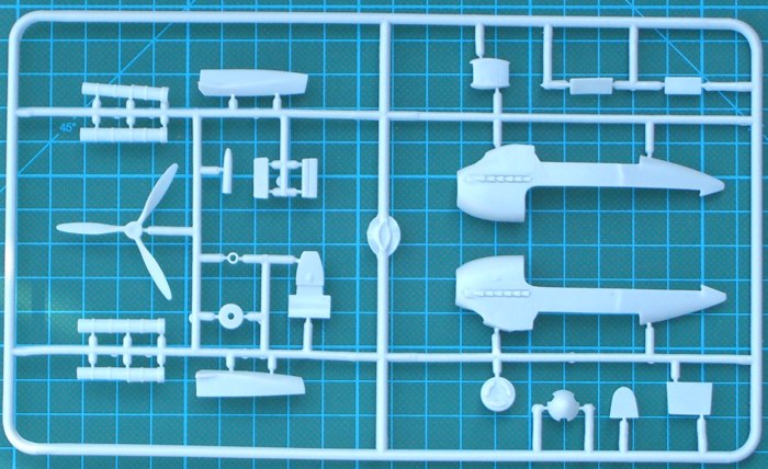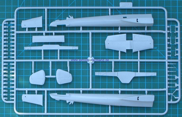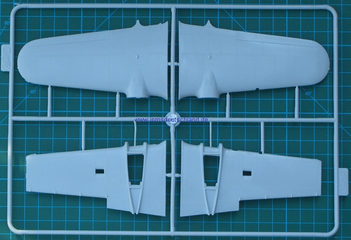 Wie schon bei der SB-2 des gleichen Herstellers, besitzt dieser Bausatz auch wieder zwei Tragflächenholme und die Aufteilung der Tragflächenteile orientiert sich am Original. Die Gabel für das Spornrad ist an die Rumpfhälften angespritzt.