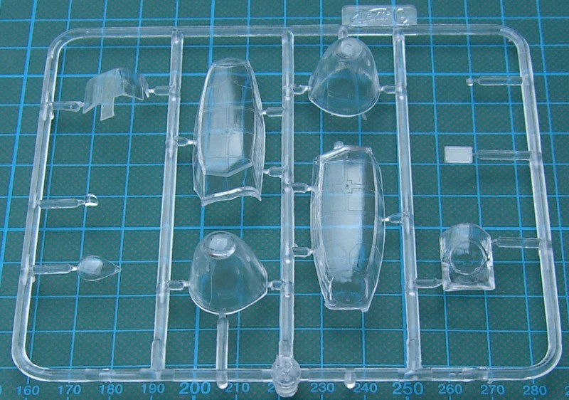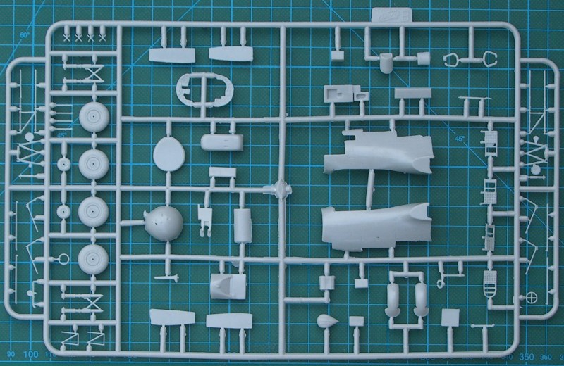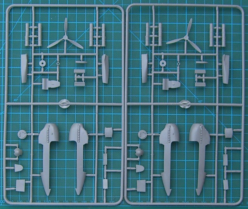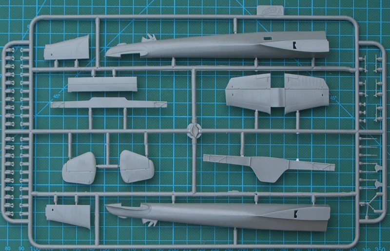 Der stabile Karton gibt nach dem Öffnen fünf (!) (Triebwerksteile sind auf zwei identische Rahmen verteilt) hellgraue Spritzgussrahmen und einen Klarsichtrahmen preis. Die Teile überraschen durch ihre filigrane Ausführung. Es gibt aber auch ein wenig Grat. Schön fein sind die Gravuren. Im Bereich der Tragflächenwurzel gibt es an der Unterseite sehr leichte Sinkstellen. Es befinden sich zwar im Cockpitbereich Auswerfermakierungen. Diese sind jedoch so angeordnet, dass sie sich gut entfernen lassen. Natürlich ist der Bausatz modular aufgebaut. Das Rumpfvorderteil ist separat. Die speziellen Teile für die Do 215 befinden sich auf zwei Spritzlingen.
