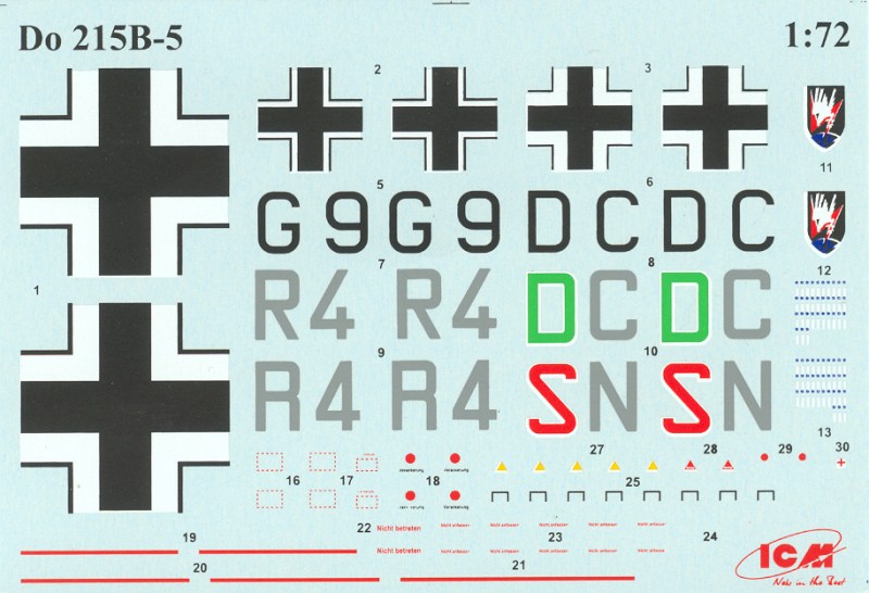In der Kabine werden sehr filigrane Teile verbaut. Nach meinem Empfinden sollte man noch ein paar Sitzgurte nachrüsten. Das wäre es dann auch. Erstaunlich sind die ganzen Kassetten mit MG-Munition. Hier hat ICM gut mitgedacht. Bei der Platzierung der Bauteile ist Konzentration angesagt. Locations sucht man hier vergebens. Das Fahrwerk ist sehr filigran. Hier ist man bei ICM beim Formenbau bis an die Grenze des Machbaren gegangen. Schön! Die auf hellblauem Papier gedruckten Decals umfassen auch Wartungshinweise. Hoheitsabzeichen für das Seitenleitwerk gibt es in keiner Form.