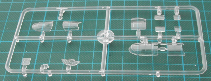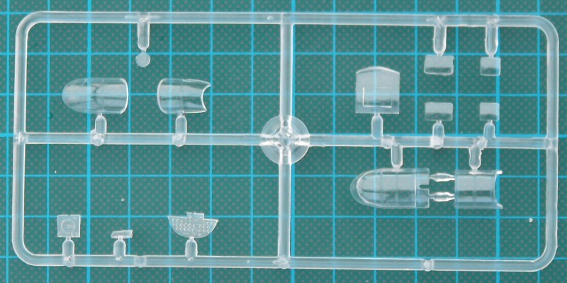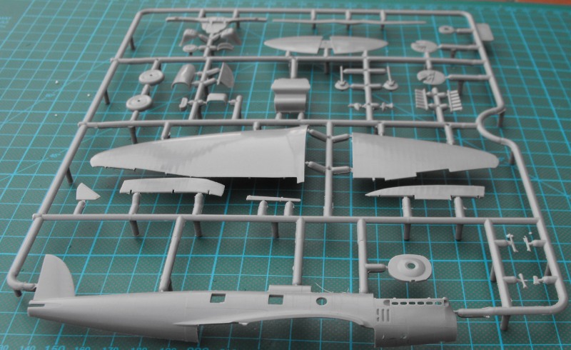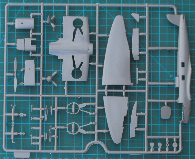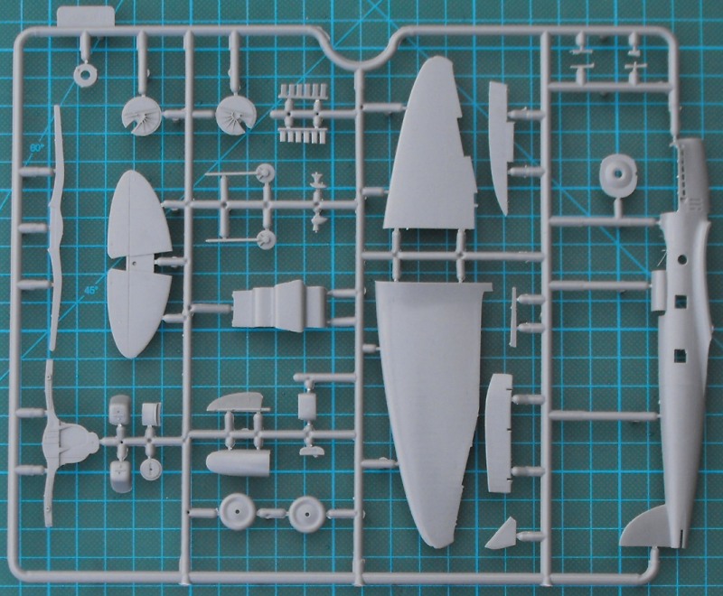 Nach dem Öffnen ist man erschlagen von der Fülle an Teilen. Es gibt zwei hellgraue Rahmen mit Spritzgussteilen, einen kleinen Spritzgussrahmen Klarsichtteile, eine recht unübersichtliche (klein und in schlechter Qualität gedruckte) Bauanleitung, und einen Decalbogen. Ein paar Teile wandern in die Grabbelkiste, da sie für andere Versionen bestimmt sind.