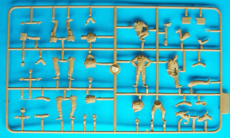 Dieser Satz enthält sieben Luftwaffesoldaten und einen Hund. Allesamt sind sehr schön modelliert und fast ohne Grat abgespritzt. Auch die Posen der Figuren und deren Interaktionen können überzeugen. Mir gefällt der dicke Major mit dem hochgezogenen Koppel am besten. Ganz ohne Erfahrung kann der Flaksoldat (rote Kragenspiegel auf dem Karton) nicht sein, da er das Deutsche Kreuz auf der rechten Brust trägt. Ein weiteres Highlight ist die Gruppe um den Hund. Irgendwie erinnert die Ideenvielfalt und das Auge fürs Detail an die 1/35er Figurengruppen von Masterbox.