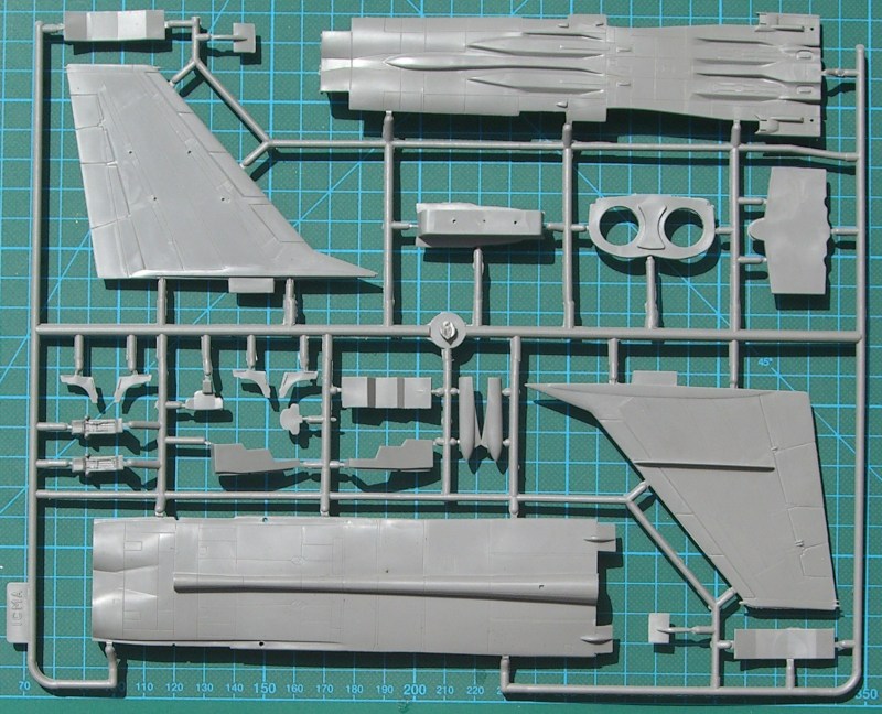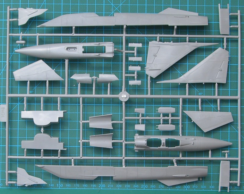 Bausatz: Bei diesem Bausatz dürfte es sich um einen „alten Bekannten“ handeln. Es ist der schon mal unter dem Label „Condor“ erschienene Kit einer MiG-31B. Das ist keinesfalls ein Nachteil, denn der Condor-Bausatz war nicht wirklich im deutschen Handel. Der gut gefüllte Karton enthält vier graue Spritzlinge und ein Klarsichtrahmen. Die Bauteile sind feiner als beim Mitbewerber Revell/Zvezda. Das Cockpit ist trotzdem für heutige Ansprüche relativ rustikal. Leider gibt es bisher kein Detaillierungsset für die MiG-31. Aber immerhin gibt es von NeOmega die K36-DM Schleudersitze. Der Rumpf besteht im Bugbereich aus Ober- und Unterschale und gleiches gilt für den Heckbereich. Die Seitenleitwerksflossen werden separat angesetzt. Leider fehlt für das perfekte Ausrichten eine Frontansicht. Die Triebwerksauslässe sind recht passabel detailliert. Gleiches gilt übrigens auch für das komplexe Fahrwerk der 31. Die Glasteile sind mehrteilig. So steht einem offenem Cockpit nur wenig im Wege. Soll heißen: Gut geeignet für all die, die sich nicht an dem dicken Spritzgussmaterial stören.