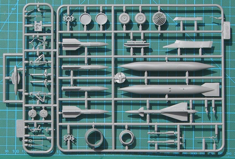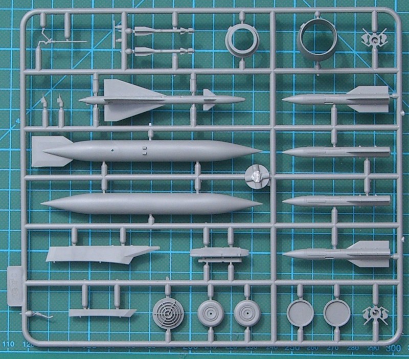 Für die Bewaffnung liegen recht ordentliche Repliken dabei. Selbst die Stabilisierungsflossen sind ausreichend dünn. Bei den Bemalungsoptionen gibt es eine Enttäuschung. Die recht farbenprächtige rote 08 vom Bausatzcover findet sich nicht auf dem Decalbogen oder in den Bemalungshinweisen! Dafür gibt es vier recht interessante Vorbilder.