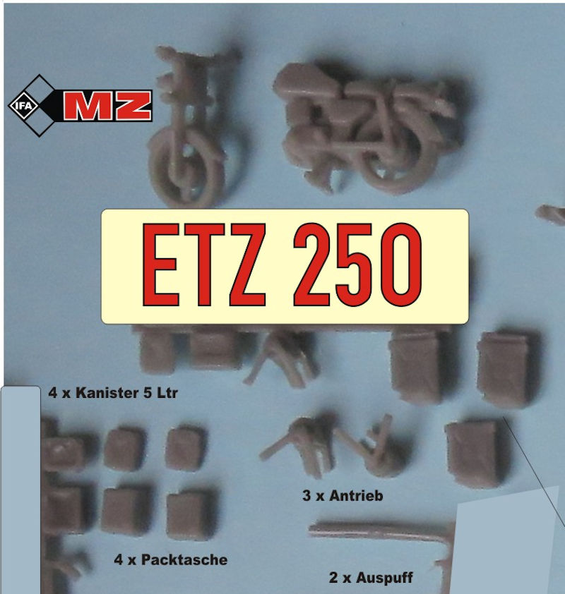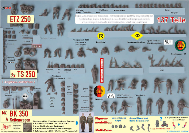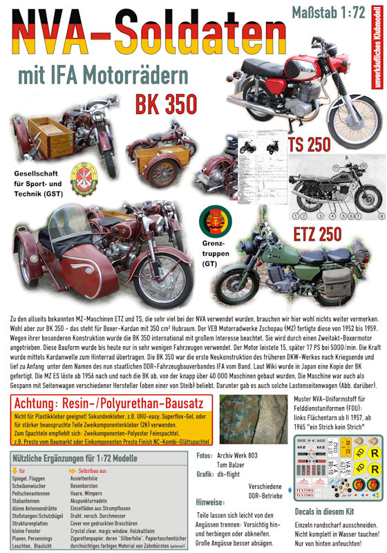 Bei den Motorrädern handelt es sich um die MZ BK 350 mit Seitenwagen, ETZ 250 und TS 250. Von letzterer sind sogar zwei Exemplare enthalten. Genutzt wurden alle Motorräder von der Nationalen Volksarmee und den Grenztruppen, aber auch zivil waren sie erhältlich. Daher gibt es passenderweise einen kleinen Decalbogen mit verschiedenen Kennzeichen, Markierungen der NVA, Grenztruppen, diverser Betriebe und Vereine. Auf einige geht der Beipackzettel genauer ein.