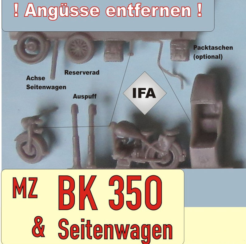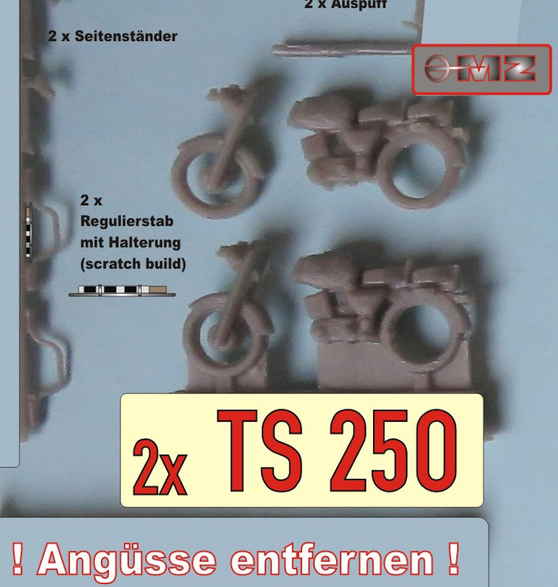 Fazit: Der Bausatz ist vor allem für Liebhaber von DDR-/ NVA-Modellen eine Bereicherung, da die Motorräder in diesem Maßstab sonst nicht erhältlich sind. Sie lassen sich mit den beigegebenen Teilen gut auf Dioramen, aber auch einzeln darstellen. Geeignet ist der Bausatz für Modellbauer mit Erfahrung im Umgang mit Resin.