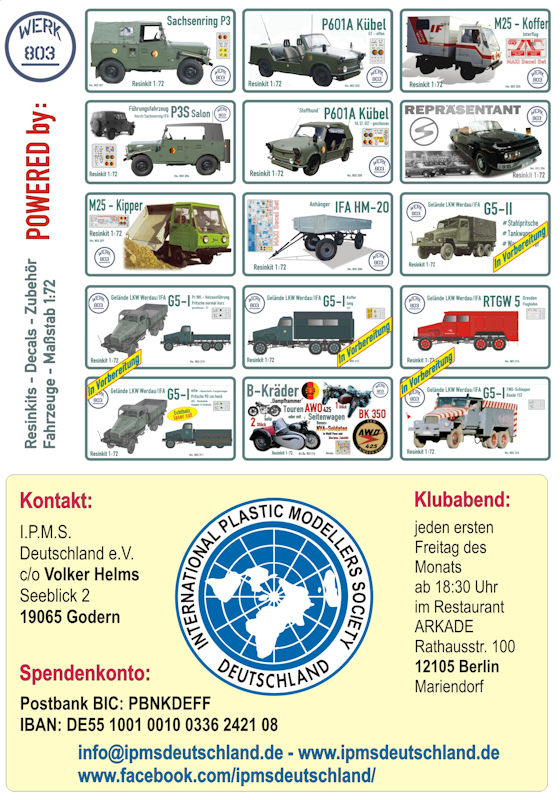Bausatz: Die I.P.M.S. Deutschland hat einen neuen Klubbausatz in 1:72 herausgebracht. In der ersten Auflage sind vier unterschiedliche Motorräder der DDR, Decals sowie einem zusätzlichen Konvolut an Figuren verschiedener Ostblockstaaten enthalten.