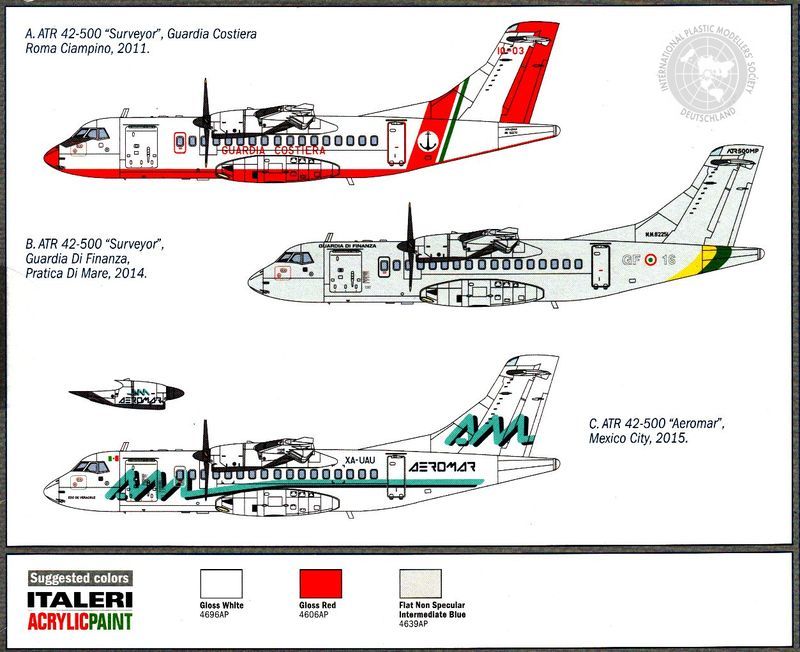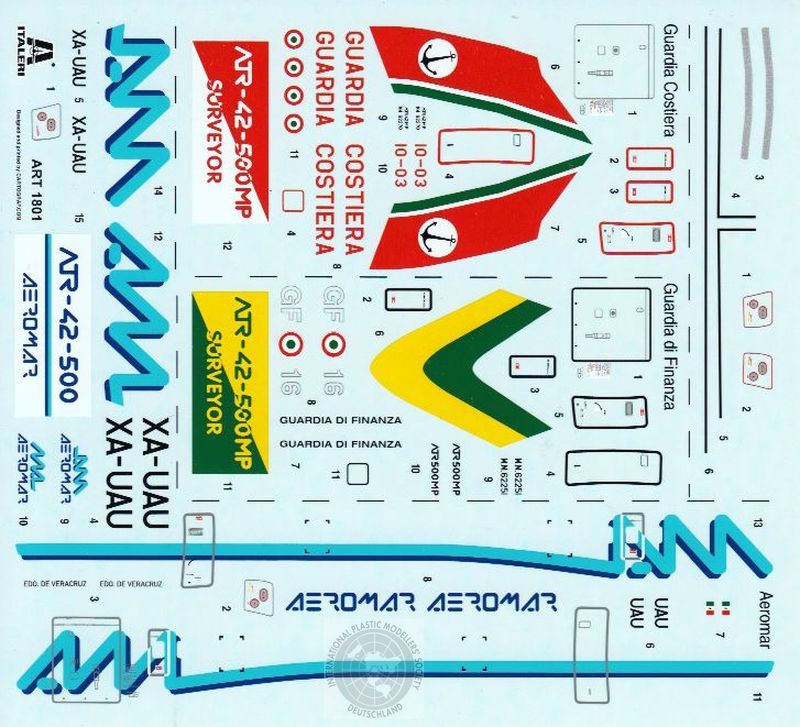 Decals: Die Decals sind sauber gedruckt und bieten alle nötigen Bilder für zwei militärische (Italienische Küstenwache und Zoll) und eine zivile Variante (Aeromar) an. Einige Detaildecals ergänzen den Bogen. Gedruckt wurde bei Cartograph in Italien, dort wo Revell auch drucken lässt. Das verspricht Gutes.