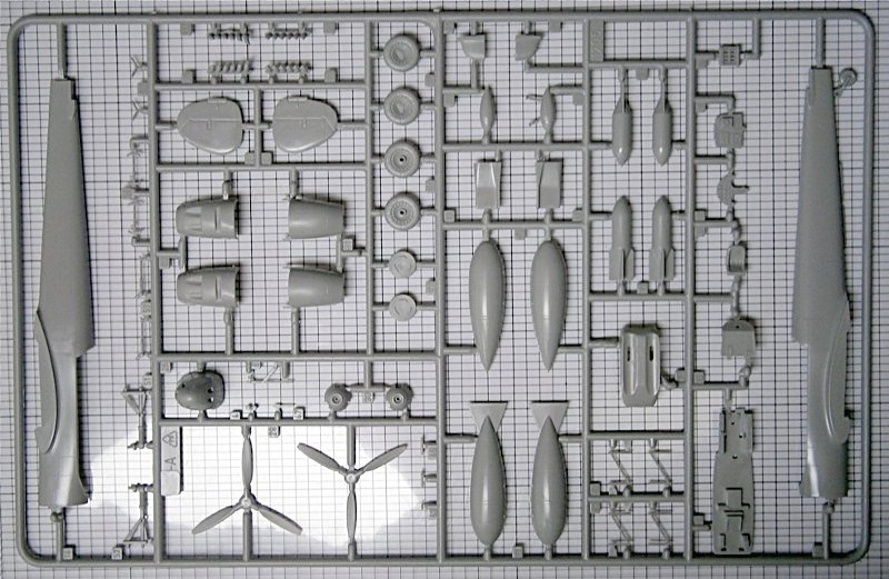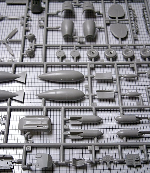 Der unterhalb des Rumpfbauches zu montierende doppelte ETC 500/IXb Bombenträger, wirkt dagegen bereits regelrecht armselig da er nicht einmal das Niveau des alten Frog-Kits erreicht.Was aber nicht zu stören braucht wenn man denn die im Baukasten einliegenden Bomben nicht montieren will. Des Weiteren wirken bei diesem Bausatz auch noch die Propeller vom Durchmesser etwas zu klein geraten, wofür sicherlich auch die leicht überdimmensionierten Spinner schuld sind.