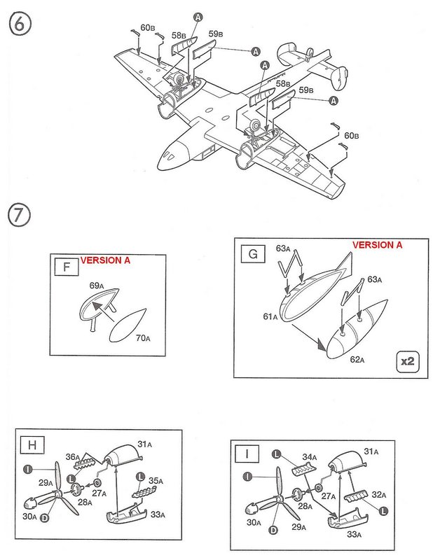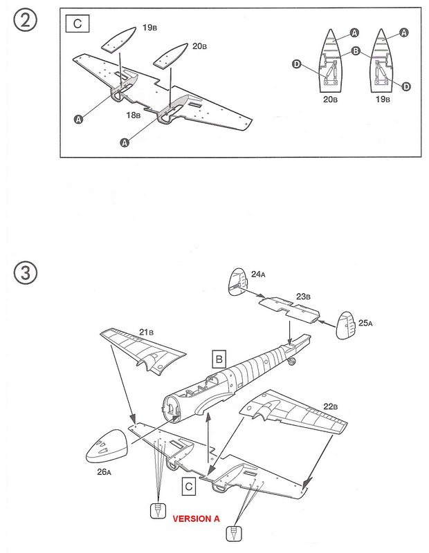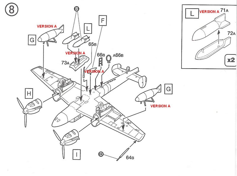 Eigentlich hätte die Bauanleitung ja den Bau zweier Versionen, (im Italeri-Jargon stets nur als "A" und "B" bezeichnet), dokumentieren sollen. Die hier einen Langstreckenjäger bzw. einen frühen Nachtjäger aus dem Mittelmeerraum repräsentieren. Wie nicht gerade selten unterscheiden sich die gewählten Vorbildmaschinen außer der Bemalung auch hier, nur noch aufgrund mitgeführter optionaler Bomben nebst den dafür notwendigen Aufhängungen voneinander Italeri schreibt deren Montage allerdings ostentativ vor. Wodurch dieser lediglich nur für für das Modell "A" korrekte Bauabschnitt aber letztlich als ein weiterer notwendiger Schritt zur finalen Fertigstellung beider Varianten interpretiert werden muss! Das selbe trifft ebenfalls auch auf die Verwendung der zwei großen 900 l Zusatztanks zu. Versions-Angaben tauchen nämlich viel später auf, d.h. konkret erst innerhalb den Bemalungs- und Abziehbild-Hinweisskizzen am Ende der Bauanleitung!