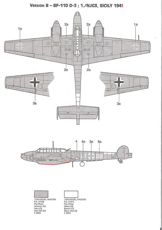 Der zweite Bemalungsvorschlag ist dann nicht ganz so heikel, obwohl aber auch er nicht vollkommen unproblematisch ist. Zu aller erst ist bereits die bei dieser Empfehlung angegebene Baureihe in Frage zu stellen. Originalphotos zeigen nämlich stets eine Maschine ohne verlängerten Hecksteiß, womit es sich daher bei dem Original weit mehr um eine Bf 110C anstatt einer D-Version gehandelt haben dürfte. Auch ist der angegebene Einsatz-Zeitraum, also 1943, nicht korrekt da seinerzeit bereits Nachtjäger der G-Baureihen verwendet wurden. Da die betreffenden Bildunterschriften stets Catania und 1941 angeben, dürfte hier also Italeri mit "Sicily 1943" definitiv falsch liegen.