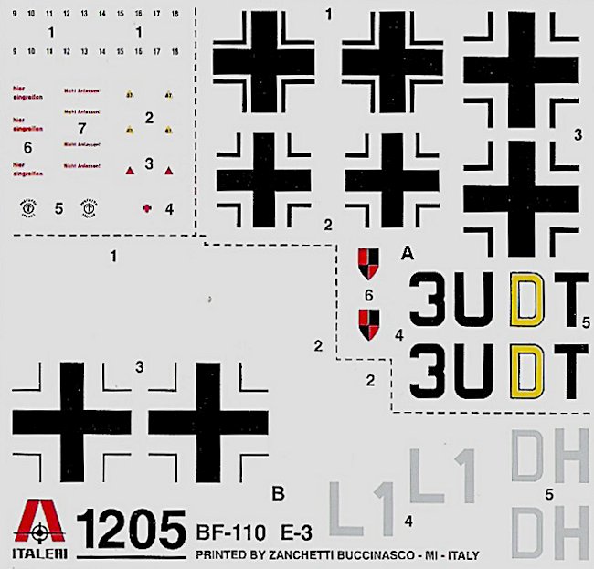 Leider ist aber auch dieser wichtige Bausatz-Bestandteil mit vermeidbaren Fehlern behaftet! So hat der verantwortliche Grafiker hier unbegreiflicher weise die zwei charakteristischen, weißen, Runen innerhalb des ZG 26-Geschwaderwappens (dem auch noch die abgerundete linke Ecke fehlt) vergessen, und ferner bei einem Stencil "Preffmut" statt Pressluft geschrieben, was man allerdings nur unter der Lupe erkennen kann.