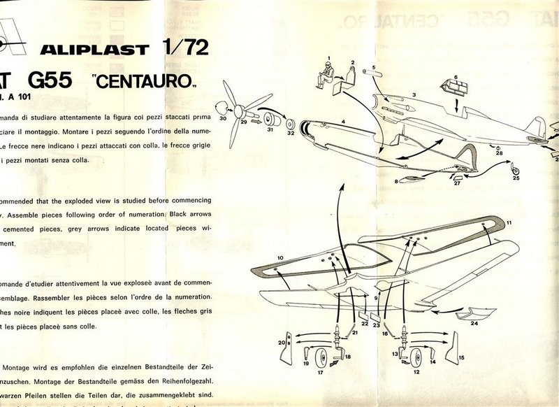 Über die Historie der Fiat G55 „Centauro“ werde ich hier nicht weiter schreiben, da es im „World Wide Net“ jede Menge Informationen darüber gibt. Der Bausatz selbst besteht aus 35 Einzelteilen, die sauber in hellgrauen und klaren Plastik gefertigt sind. Anhand der damals üblichen 2-seitigen Bauanleitung (im Explosionszeichnungs-Stil) mit Farbangaben dürften keine größeren Schwierigkeiten beim Zusammenbau dem Anfänger, wie auch dem fortgeschrittenen Modellbauer bereiten!