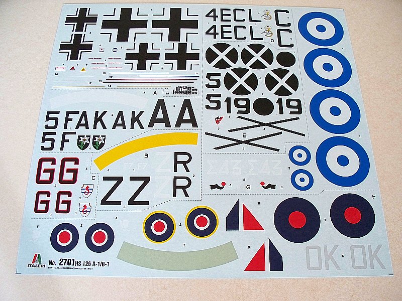 Der Decalbogen umfasst sieben Möglichkeiten der Henschel ihre Kennungen zu geben. Darunter auch eine britische Beutemaschine und ein Flugzeug der griechischen Luftwaffe. Historisch interessant dürfte auch das Schleppflugzeug sein, welches zusammen mit einem DFS 230 Lastensegler das damalige „Rettungspaket“ für Benito Mussolini ergab.