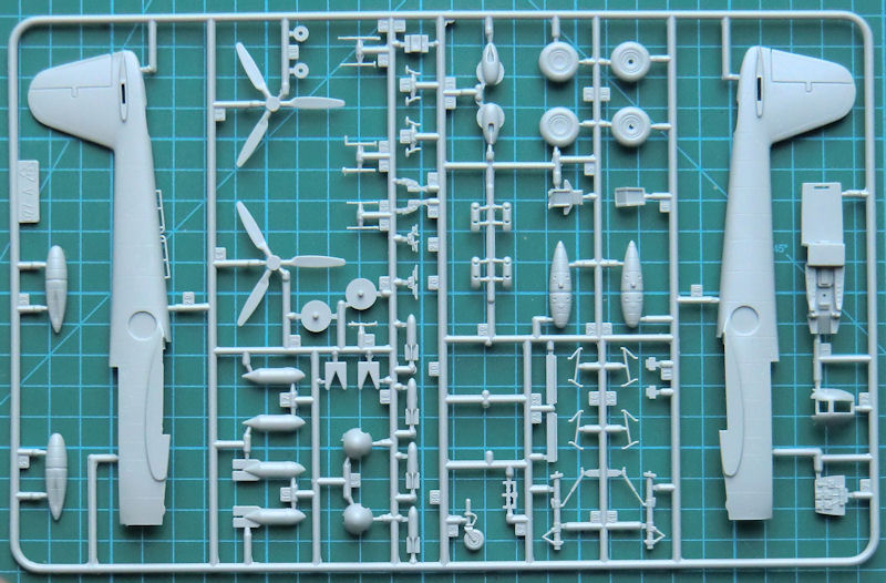 Die Teile besitzen eine schöne Struktur und z.T. feine scharfe Gravuren. Einige Kleinteile sind doch etwas klobig. Gegenüber dem 410er – Bausatz aus gleichem Hause unterscheidet er sich vor allem in den Bauteilen für die Tragfläche. Denn diese wurde bekanntlich auf dem Weg zur 410 geändert. Der Bau beginnt auch hier mit dem Cockpit. Hier gibt es hier nur das Nötigste. So hat der Modellbauer eine Bodenplatte mit zwei Sitzen, zwei Teilen für die Instrumente, einen Steuerknüppel und ein Bord für den Heckschützen. Immerhin gibt es ein paar Detailsets zur Verbesserung der Situation.