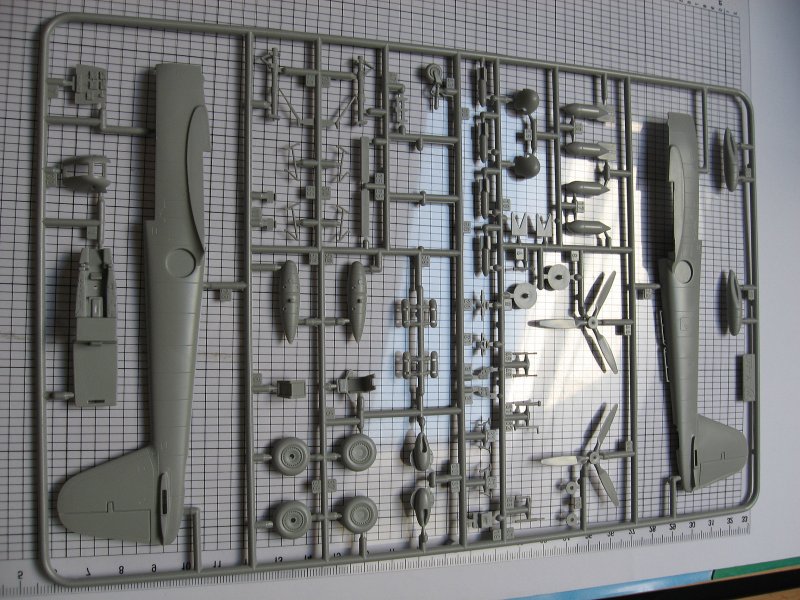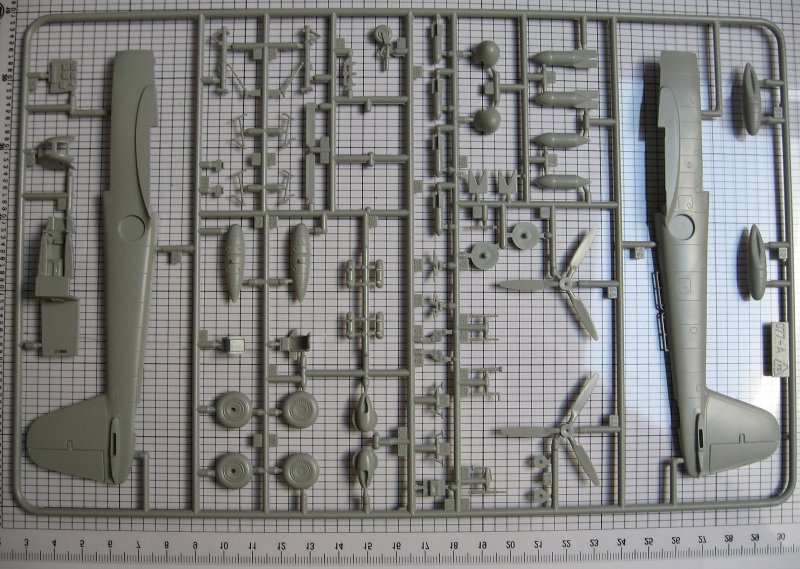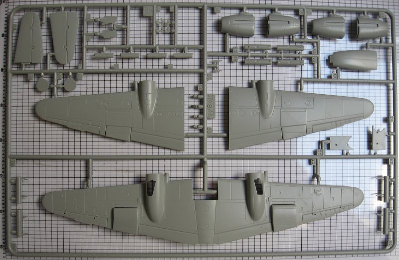 Der Spritzling der die beiden Rumpfschalen wie auch alle weiteren Teile zur dessen Komplettierung enthält, ist völlig identisch mit demjenigen aus dem ebenfalls bereits nicht mehr angebotenen Me 210-Bausatz, welcher übrigens auch einige Zeit von Bünde aus in Lizenz angeboten worden war. Die Verwendung gleicher Teile bei diesen Messerschmitts wäre diesmal aber nicht ganz so problematisch. Weil es innerhalb der durchaus reichhaltigen Fachliteratur nirgends überzeugend glaubhafte oder besser ausgedrückt wirklich stichhaltige Hinweise dafür gibt, was denn am Hornissen-Rumpf konkret anders als am den der (nachträglich verlängerten) 210er war. Daher muss man fast davon ausgehen, dass seinerzeit tatsächlich fast identische Rümpfe Verwendung fanden. Schließlich soll es vom zuvor eingestellten Me 210-Bauprogram noch etliche auf Halde liegend gegeben haben.