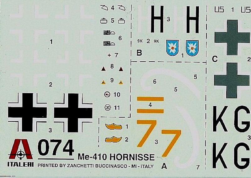 Sicherlich kann es mal beim Arbeiten mit dem CAD-Program dazu kommen das im Layout die Unterseiten-Skizze seitenverkehrt ausgegeben wird. Das man darüber hinaus vergisst das weiße Rumpfband an der „Gelbe Sieben“ als weiß zu streichende Fläche zu deklarieren, will ich zähneknirschend auch noch nachsehen. Die tadellos gedruckten Stencils am erstaunlich kleinen aber feinen Decalbogen auszudrucken, aber dann deren Position auf einer ausgesprochenen Mini-Skizze (im 1/144er Maßstab, sic!) mit deshalb nur noch recht undeutlich, vage weisenden Pfeilen anzugeben, ist dann aber echt nicht mehr fair. Da hätte Italeri wirklich besser und genauer sein müssen. Die Bemalungsvorschläge sind ansonsten authentisch, auch wenn es nicht gerade originell ist, das eine Vorbild eins-zu-eins von Fine Molds bzw. Matchbox zu übernehmen.