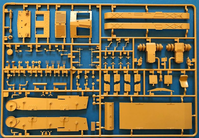 Wie aus der Teileübersicht hervorgeht, hat Italeri lediglich die Laufwerksteile und den Kasemattenaufbau inklusive Waffe von dem bereits existierendem Bausatz übernommen und liefert nun eine völlig neue Wanne mit schön gemachter Innenausstattung im Fahrerbereich. Dies ist auch so erforderlich, da die Ausführung unter Verwendung der M42 Wanne auch in der Realität etwas länger war als die Vorgänger Versionen. Interessant für mich ist, dass die Fahrzeugwanne aus fünf einzelnen Platten zu erstellen ist. Hier sollte man sich dann Zeit lassen, um alle Seiten exakt auszurichten.