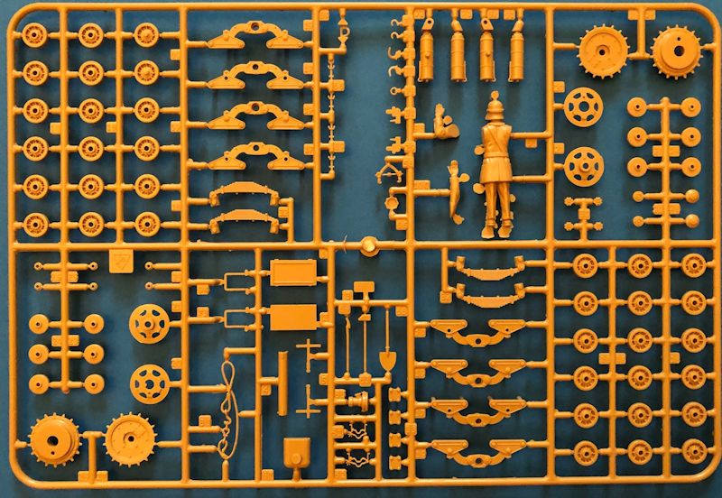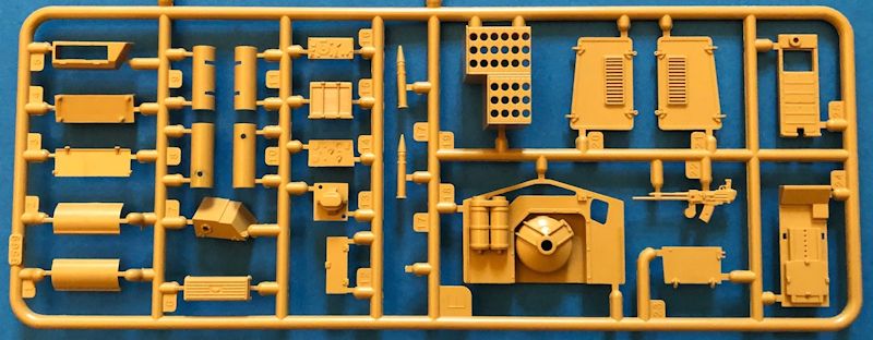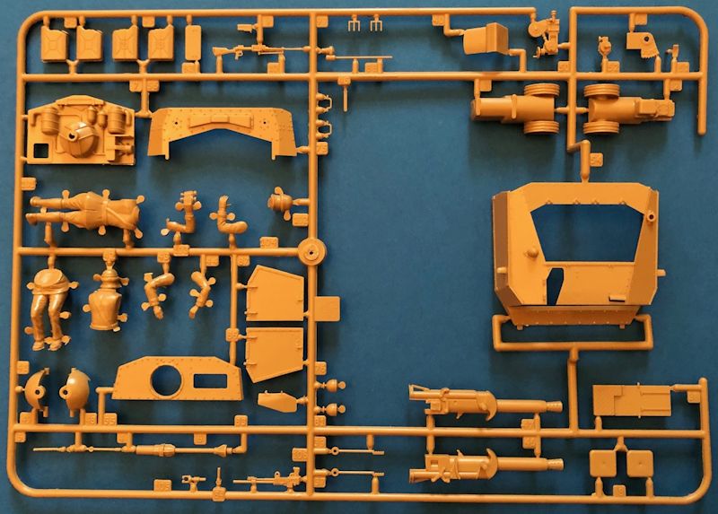 Italeri beschert uns in einem stabilen und optisch interessant gestalteten Stülpkarton erstmalig die Ausführung M42. Die Boxart sieht sehr professionell aus und zeigt das italienische Fahrzeug mit deutschen Markierungen. Die Teile sind in sandgelbem Plastik ausgeführt und auf vier Spritzlinge verteilt. Alle Teile sind sehr sauber ausgeführt und zeigen scharfe Details. Auswerfermarken und Fischhaut konnte ich nicht entdecken.