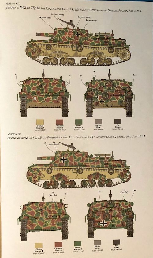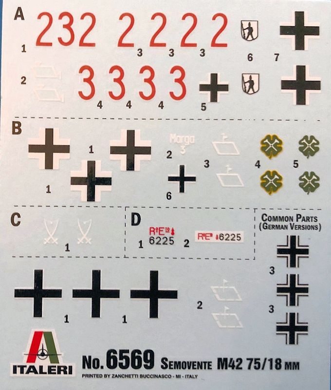 Bauanleitung/Bemalung: Der Bauplan besteht aus einem 12 seitigen Heft, in dem der Zusammenbau des Modells auf 16 Baustufen in ansprechenden Zeichnungen abgebildet wird. Hier geht man auf die Unterschiede der italienischen und deutschen Ausführung ein, die sich primär hinsichtlich Wasser- und Benzinkanister sowie Kleinteilen unterscheiden. Für vier unterschiedliche Bemalungen wovon drei mit deutschen Markierungen sind liefert ein umfangreicher Abziehbilderbogen der Firma Zanchetti das Notwendige. Für die Farbgebung findet man lediglich Referenzen auf die Italeri Codierung.