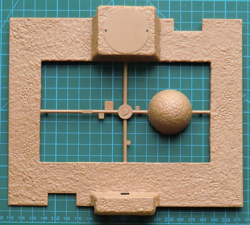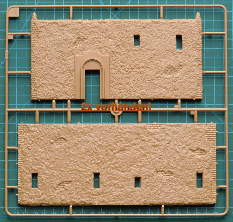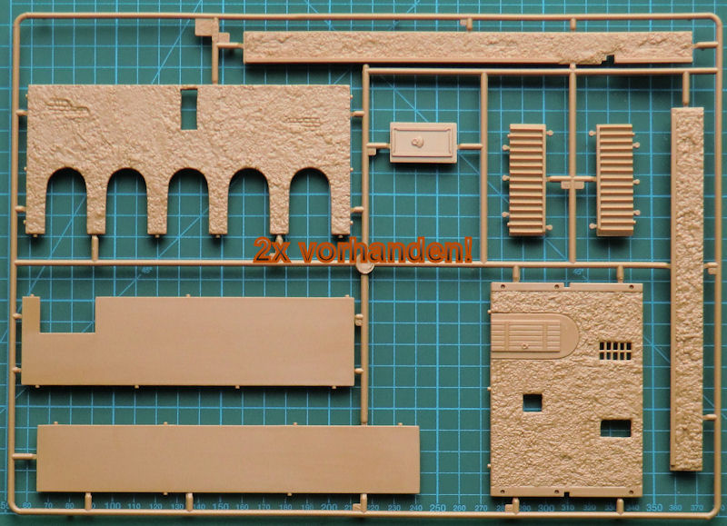 Jeweils zwei Spritzlinge, die die Wände zum Inhalt haben liegen doppelt bei. Die Struktur des Mauerwerks ist sehr gut getroffen und der Zusammenbau dürfte keine Probleme bereiten. Allerdings stellt das Modell nur das Äußere des Gebäudes dar. Es gibt keine Details für Innen. Eine Option als Ruine wird daher sehr schwierig.