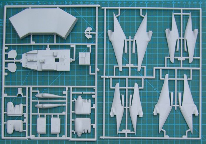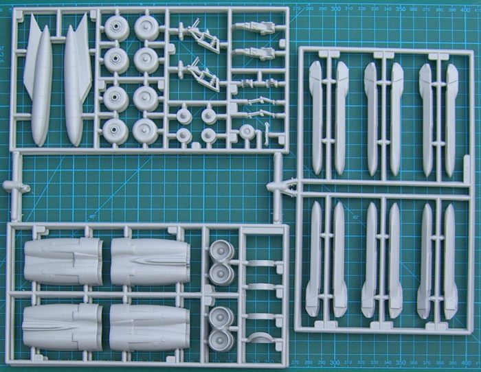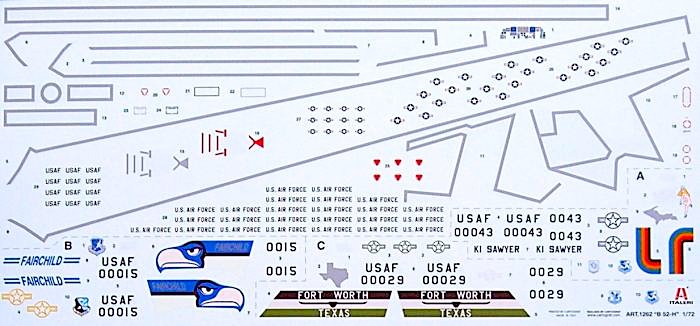 Bausatz: Wer noch bei der Ankündigung bei Italeri in Nürnberg auf eine B-52F gehofft hatte, der wurde enttäuscht. Italeri hat exakt 10 Jahre nach dem Erscheinen des Bausatzes bei AMT die B-52H wieder herausgebracht. Der Preis hat sich um gut 10 € nach oben entwickelt. AMT hatte seinerzeit auch die B-52G im Angebot. Italeri hat nichts am Bausatz ergänzt und die Decals sind z.T. auch für dieselben Vorbilder. Wie bei AMT damals üblich, hat dieser Bausatz versenkte Gravuren. Damals wurden die Formen in Korea erstellt. Der Rumpf besteht aus vier Hälften. Das Cockpit ist recht gut ausgestattet und muss nur ordentlich bemalt werden, denn durch die Kanzel ist nicht viel zu sehen. Die Fahrwerksteile sind auch gut detailliert. Der Bausatz ist einfach solide.