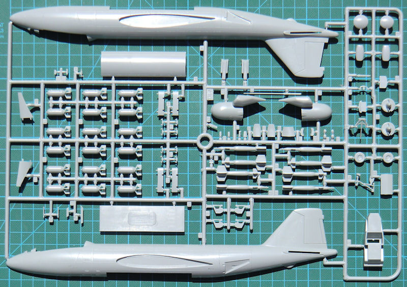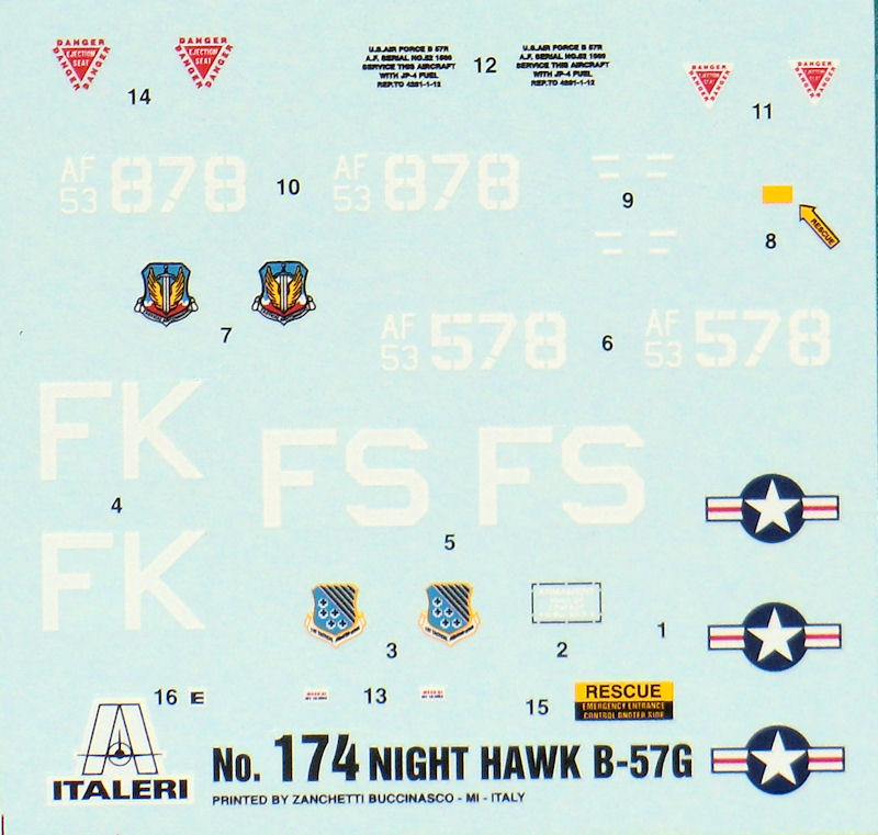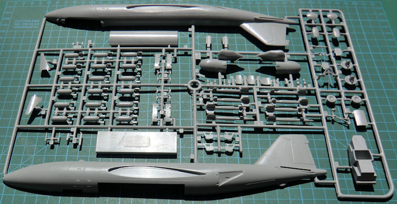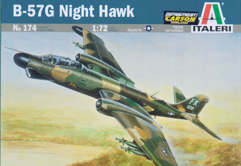 Bausatz: Die G-Verson der Martin B-57 wurde von Italeri schon vor vielen Jahren entwickelt und aus dem Bausatz der B-57B in 1/72 abgeleitet. Nur High Planes hatte vor ca. fünf Jahren eine Reihe Canberras in 1/72 entwickelt. Darunter waren auch diverse Versionen der B-57. Es waren allerdings Short-Run-Kits für abgehärtete Modellbauer. Somit ist diese unveränderte Wiederauflage der B-57G Night Hawk von Italeri sehr willkommen. In dem praktischen Stülpkarton befinden sich gut verpackt zwei hellgraue Spritzlinge mit 107 Teilen, ein Klarsichtrahmen mit fünf Teilen, ein Decalbogen und die typische Italeri-Bauanleitung.