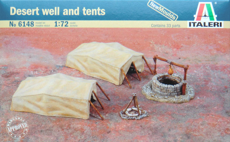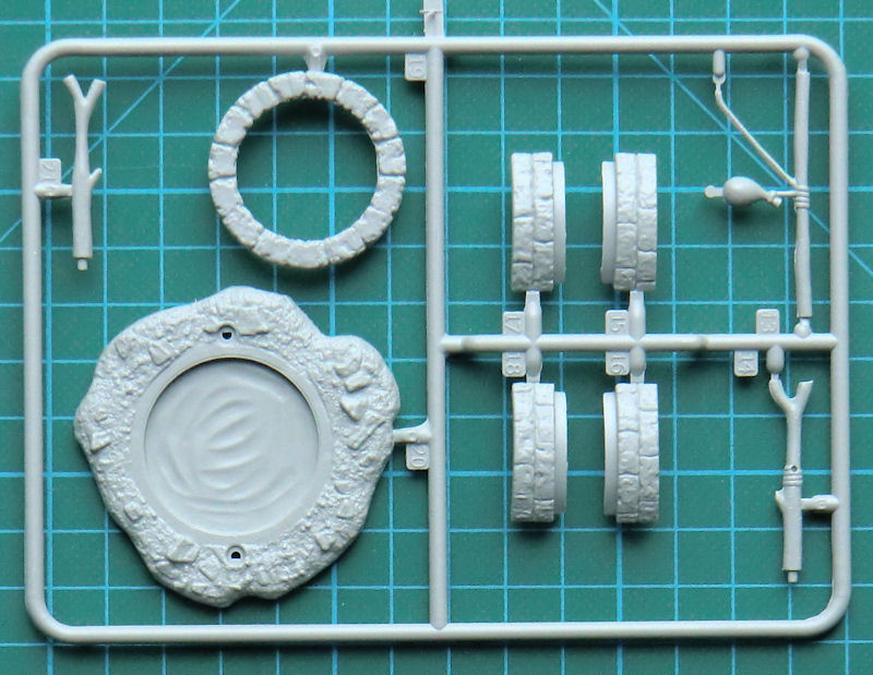 Das Set ist thematisch im nordafrikanischen Kriegsschauplatz im WK II angesiedelt und enthält Bauteile für einen Brunnen, zwei Zelte sowie zwei Feuerstellen. Der Brunnen besteht aus acht Bauteilen und benötigt fast nur noch eine vernünftige Bemalung. Ich persönlich würde das etwas zu starke Seil ersetzen. Zweimal erhält man den Spritzling mit dem Zelt und der Feuerstelle. Die Zelte besitzen eine schöne Oberflächenstruktur. Auch die Feuerstelle ist gut getroffen. Zwei identische Teile werden die meisten Modellbauer sicherlich nicht in einem Diorama verbauen.