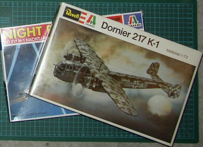 Bausatz: 1979 erschienen erstmals unter dem Label "REVELL / ITALAEREI" (siehe Karton unten) die Do 217 N-1 und Do 217 K-1. In den 90er Jahren kam noch eine Do 217 K-2 mit vergrößerter Tragfläche hinzu. Nach über 25 Jahren hat es nunmehr Italeri geschafft, den Bausatz zu modifizieren und eine Do 217E herauszubringen. Diese gab es seit über 30 Jahren nur von Airfix.