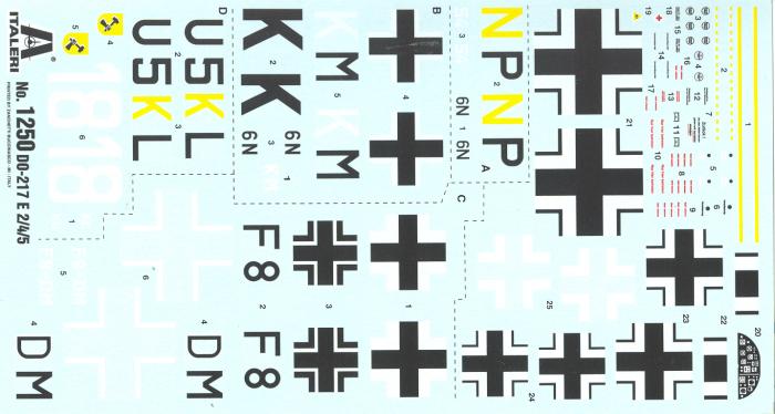 Die Lüfter der BMW-Motore waren vor 25 Jahren auch noch feiner. Bei den zu kleinen Spinnern hat sich auch nichts getan. Vielleicht bietet die Grabbelkiste da Abhilfe. Die "Macken" der Vorgängerbausätze gelten natürlich weiter. Der Decalbogen ist für Italeri-Verhältnisse recht umfangreich und ohne Versatz gedruckt. Die Spritzlinge der Do 217N und Do 217K-1 sollen den Unterschied in der Form der einzelnen Baumuster ein wenig verdeutlichen.