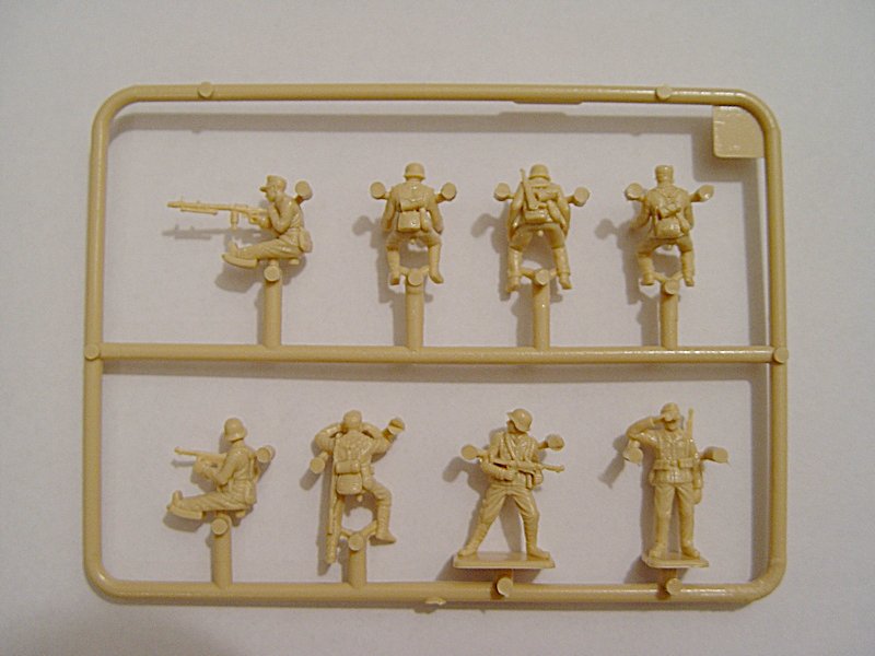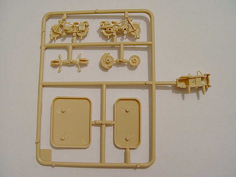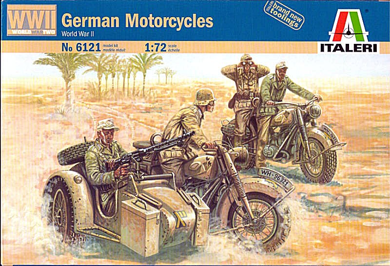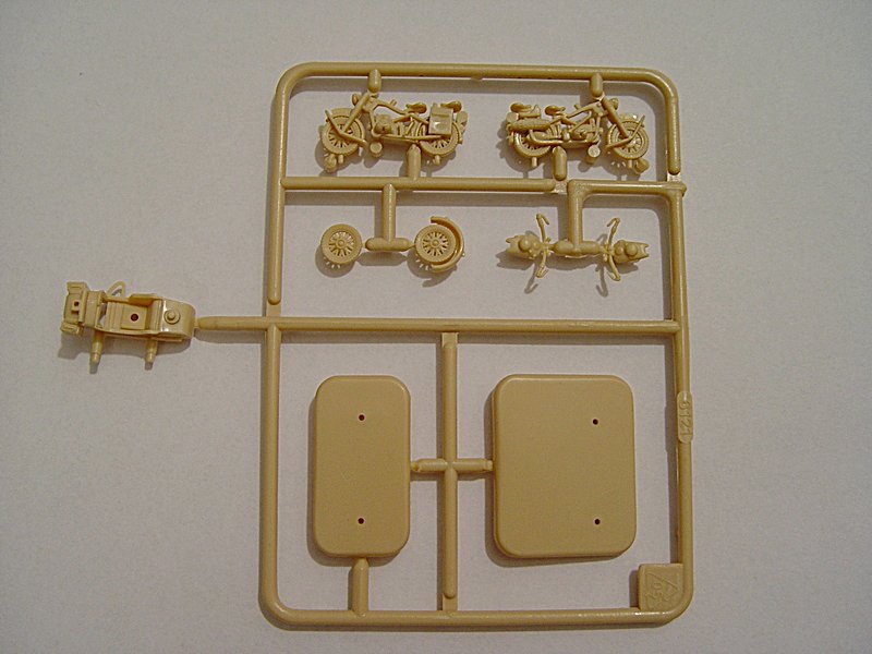 Modell: Auch dieser dreidimensionale Spritzgussbausatz ist sehr gut gelungen. Er besteht aus 2 gleichen Spritzrahmen für die Kräder und je 2 Untergrundplatten und aus 2 identischen Spritzrahmen für je 8 vollplastische Figuren. Die Körperhaltung der Krad-Besatzung erscheint realistisch, wobei die Beine der Beiwagen-Schützen sehr kurz geraten sind. Aber nach dem Einsetzen in den Beiwagen sieht man es so wie so nicht. 2 Figuren haben Tropenstiefel an, 4 der Figuren tragen die Feldmütze. Ein Krad-Fahrer mir Stahlhelm und Sandbrille sieht sehr martialisch aus, leider fehlen ihm die Daumen. Beim MG 34 könnte man das Fehlen des 50-Schuss-Trommelmagazins bemängeln.