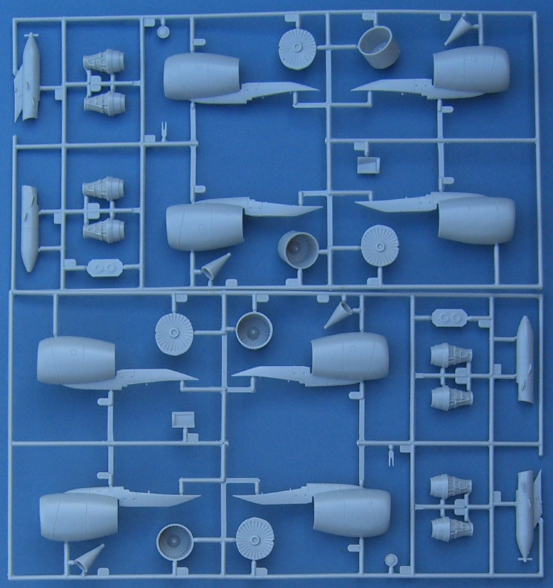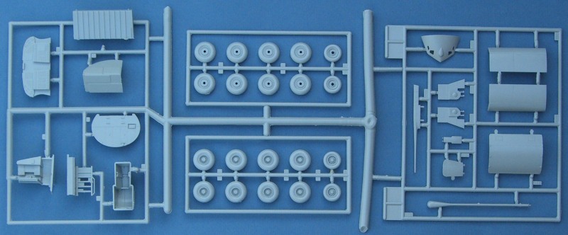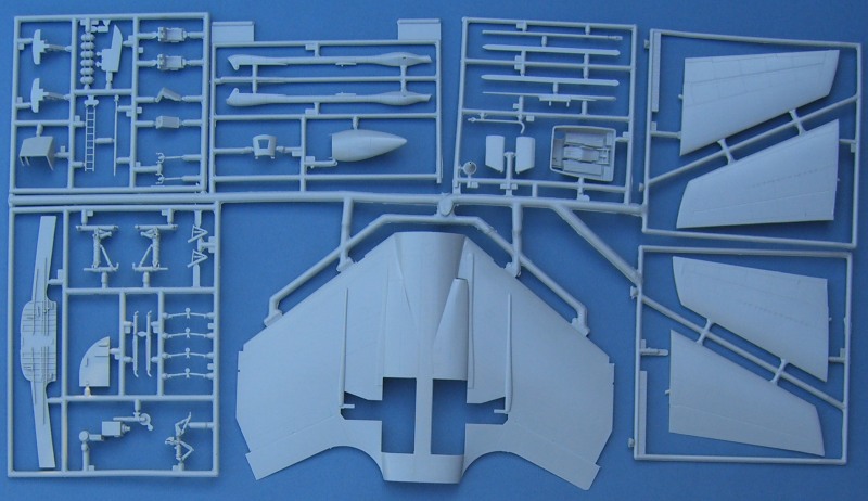Die Bauanleitung suggeriert uns fünf Spritzlinge, jedoch hat Italeri diese zerlegt, damit die Teile besser im Karton Platz finden. Dazu gibt es noch einen Rahmen mit Klarsichtteilen, einen sehr großen Decalbogen und die übersichtliche Bauanleitung.